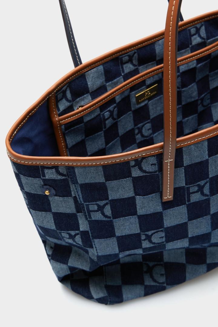 Bolso shopper en canvas de algodón con jacquard Lona Cubos Denim. Doble asa de hombro en piel, broches laterales y un bolsillo interior con cierre de cremallera. Detalle de logo PG metálico….