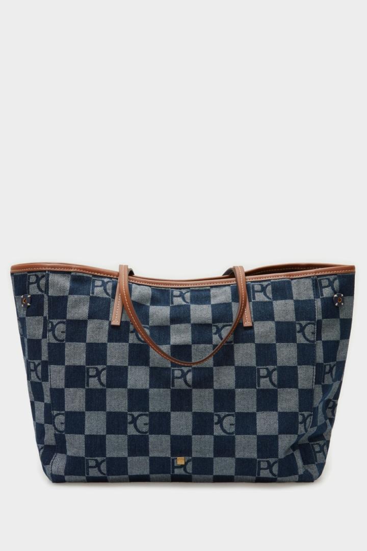 Bolso shopper en canvas de algodón con jacquard Lona Cubos Denim. Doble asa de hombro en piel, broches laterales y un bolsillo interior con cierre de cremallera. Detalle de logo PG metálico.