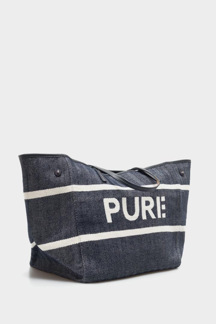 Bolso shopper grande en canvas de algodón con estampado PURE. Doble asa de piel, broches laterales y un bolsillo interior con cierre de cremallera.