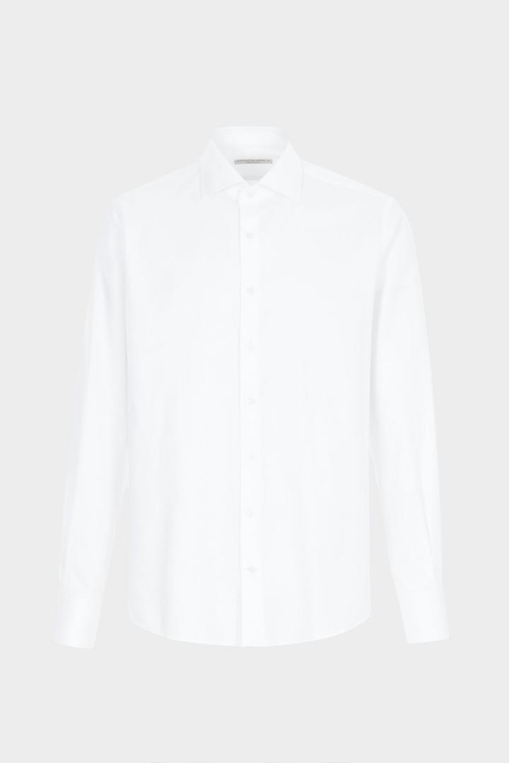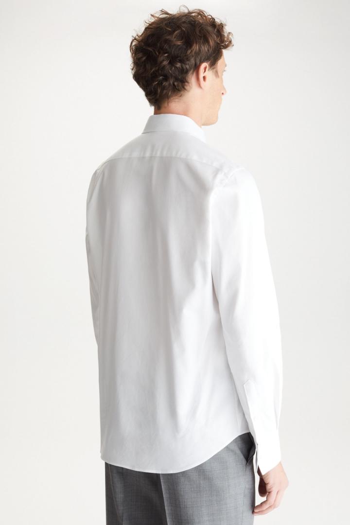 Camisa regular fit en estructura de algodón. Cuello italiano, puño gemelo, hilo de botón a tono y logo cubo bordado a tono en bajo delantero. El modelo mide 190 cm y lleva una talla 4.