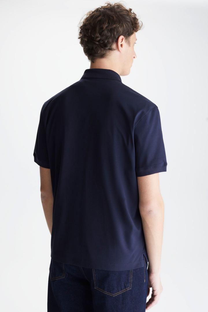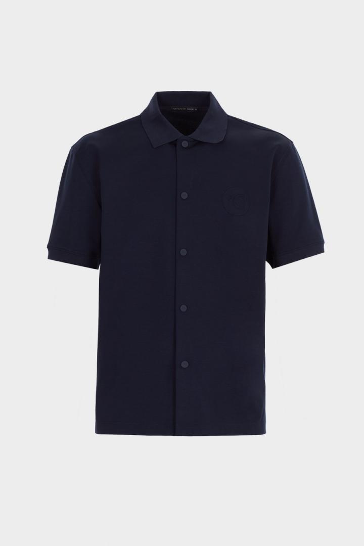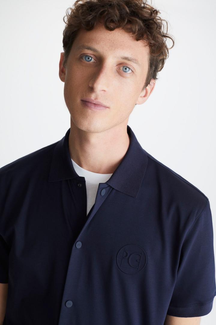 Camisa regular fit en interlock de algodón mercerizado con parche PG en relieve a tono en el pecho. Cuello camisero, cierre de broches engomados personalizados a tono, manga corta y aberturas laterales. El modelo mide 190 cm y lleva una talla M.