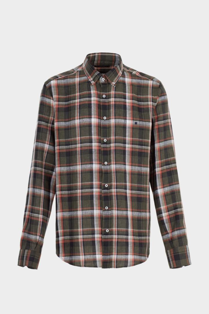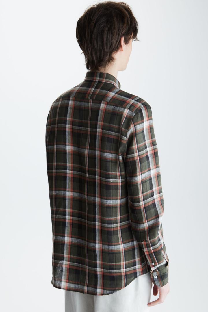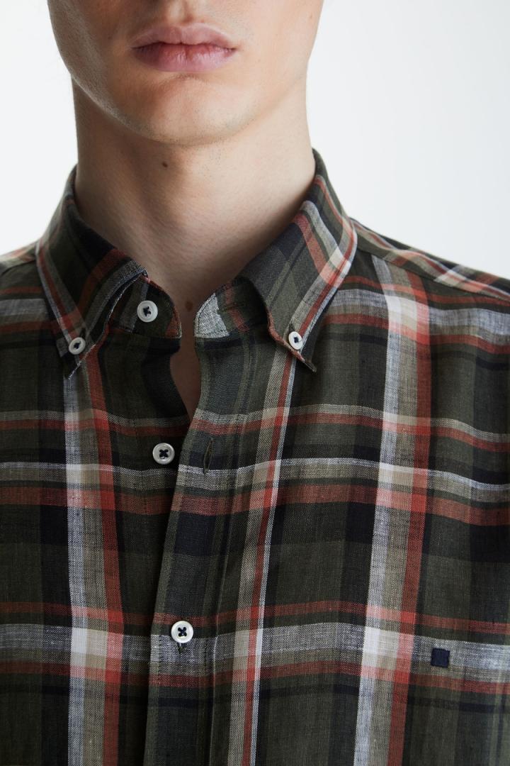 Camisa regular fit en lino con diseño de cuadros. Cuello abotonado con hilo de botón a contraste y logo cubo bordado a contraste en el pecho. El modelo mide 189 cm y lleva una talla 3.