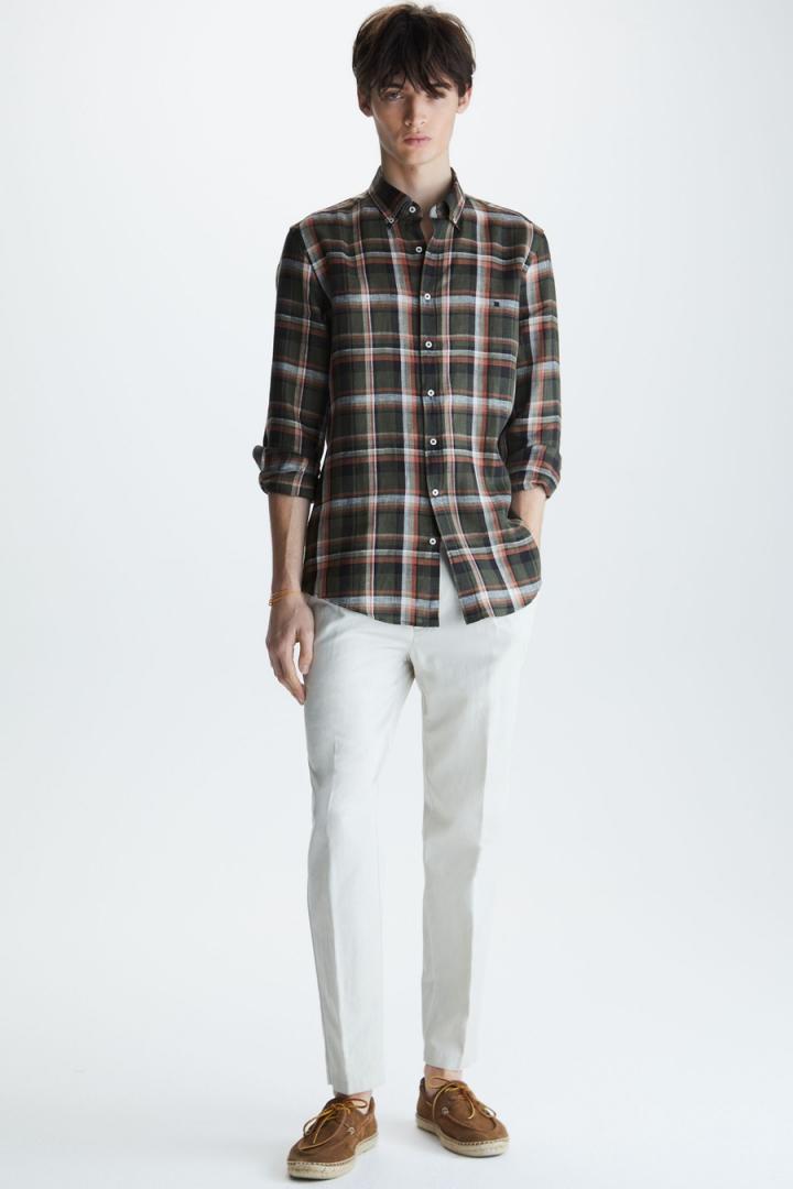 Camisa regular fit en lino con diseño de cuadros. Cuello abotonado con hilo de botón a contraste y logo cubo bordado a contraste en el pecho. El modelo mide 189 cm y lleva una talla 3….