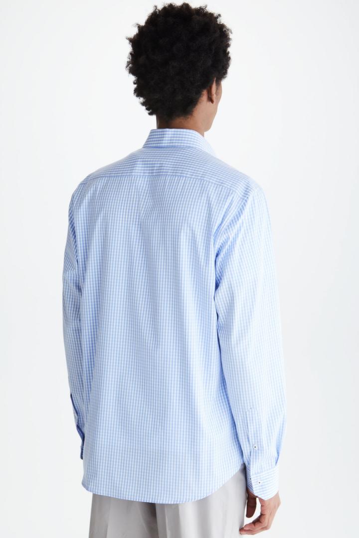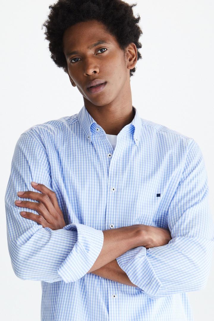Camisa regular fit en popelín de algodón con cuadros Vichy. Cuello abotonado e hilo de botón a contraste. Logo cubo bordado a contraste en pecho. El modelo mide 189 cm y lleva una talla 4.