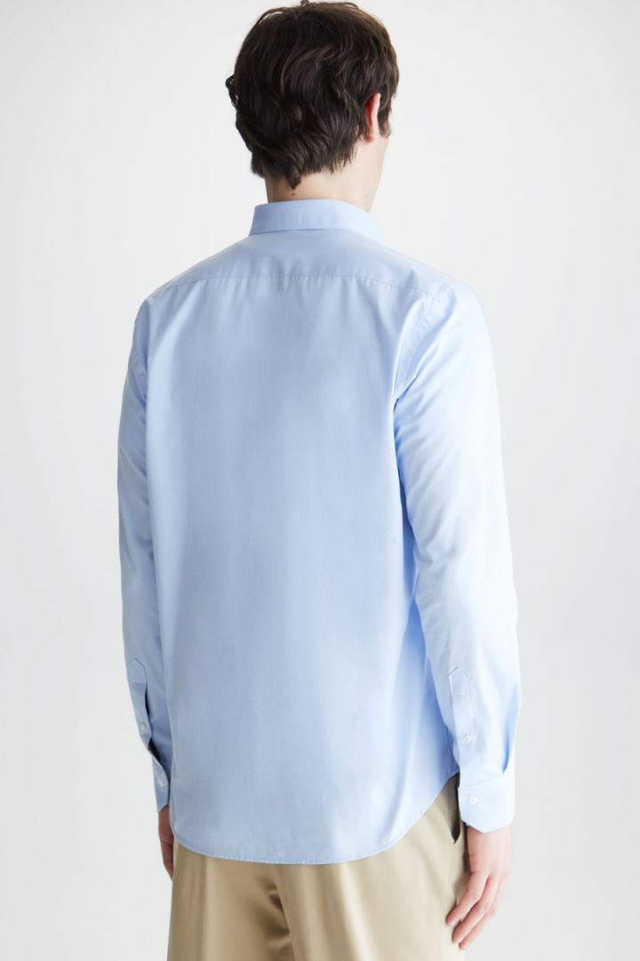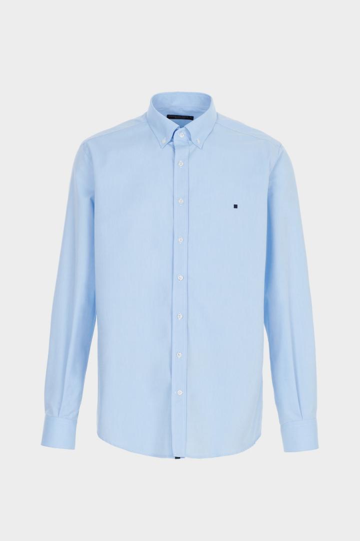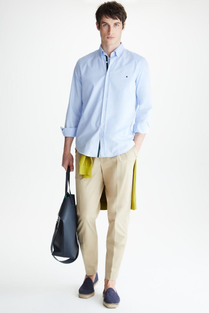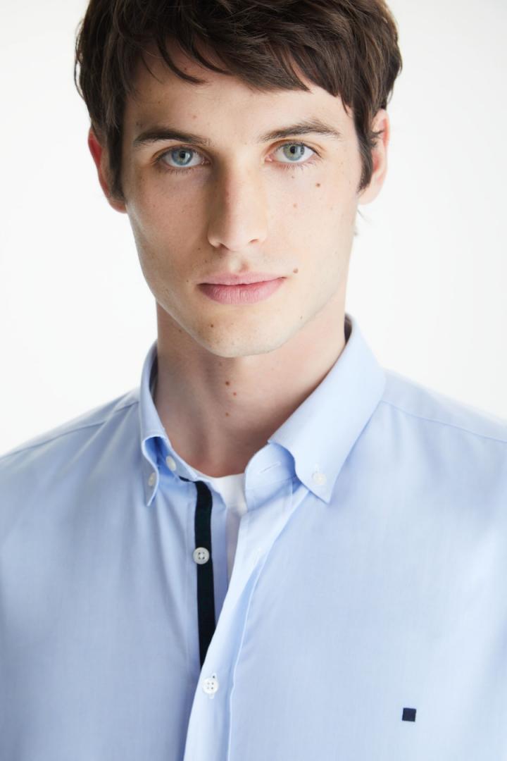 Camisa regular fit en popelín de algodón con detalle de cinta de grosgrain a contraste en interior de tapeta. Cuello abotonado e hilo de botón a tono. Logo cubo bordado a contraste en pecho. El modelo mide 187 cm y lleva una talla 4.
