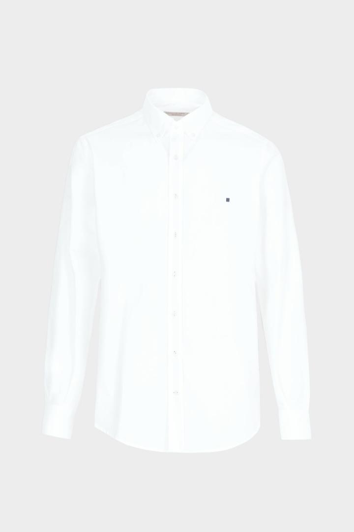 Camisa regular fit en popelín de algodón con detalle de cinta de grosgrain en interior de tapeta. Cuello abotonado e hilo de botón a tono. Logo cubo bordado a contraste en pecho. El modelo mide 190 cm y lleva una talla 4.