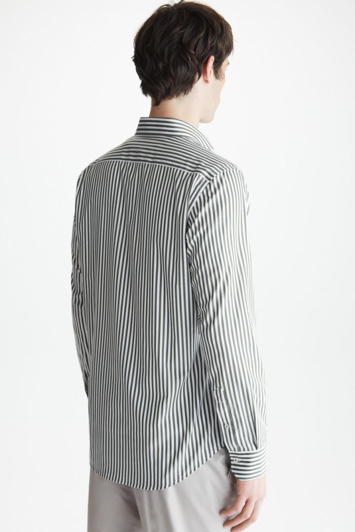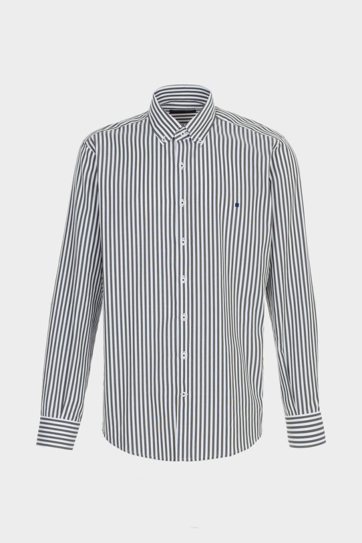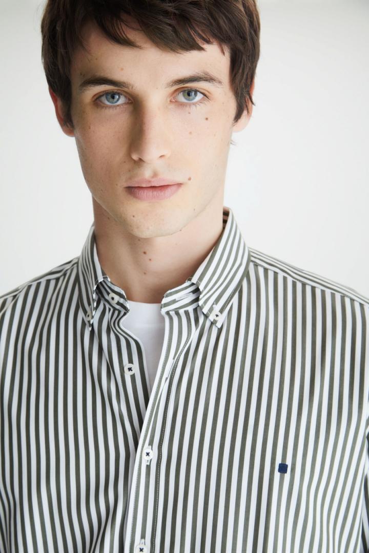 Camisa regular fit en popelín de algodón con raya candela. Cuello abotonado e hilo de botón a contraste. Logo cubo bordado a contraste en pecho. El modelo mide 187 cm y lleva una talla 4.