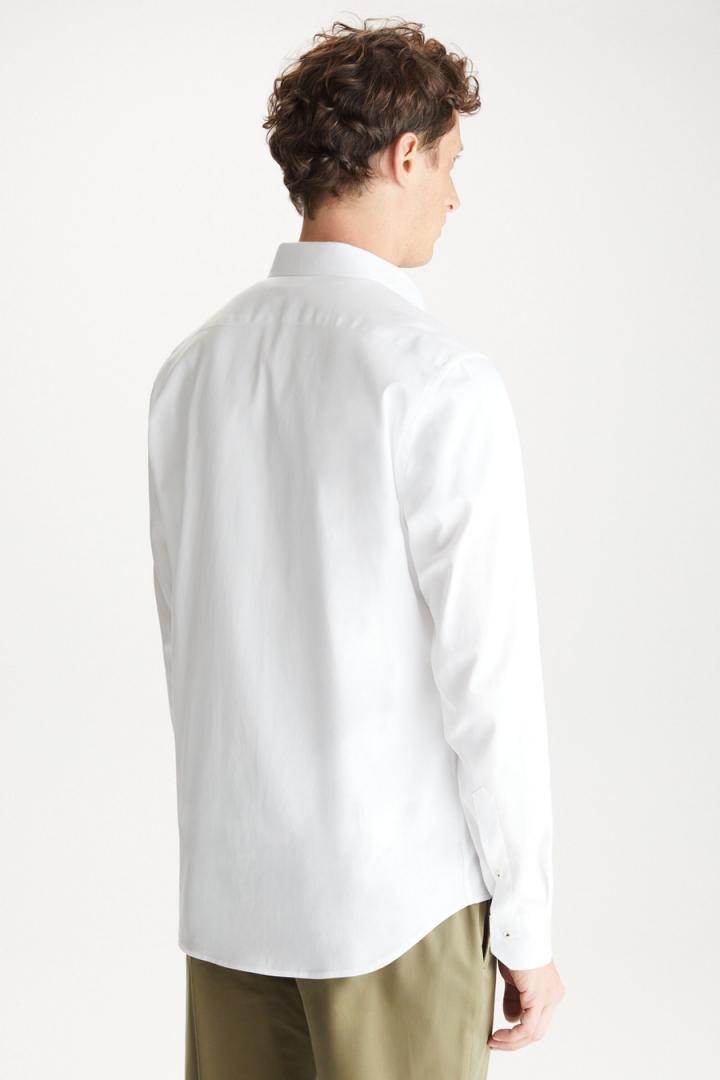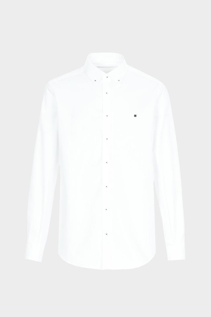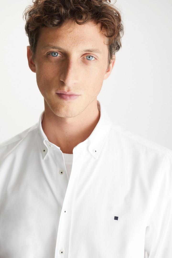 Camisa regular fit en sarga de algodón. Cuello abotonado e hilo de botón a contraste. Logo cubo bordado a contraste en pecho. El modelo mide 190 cm y lleva una talla 4.