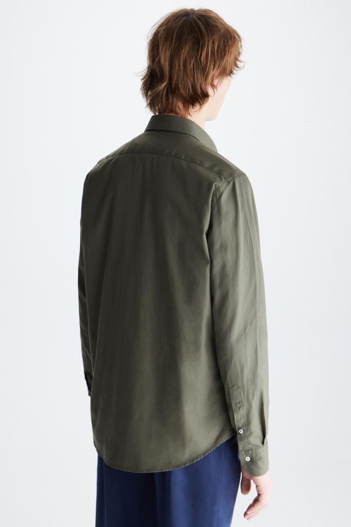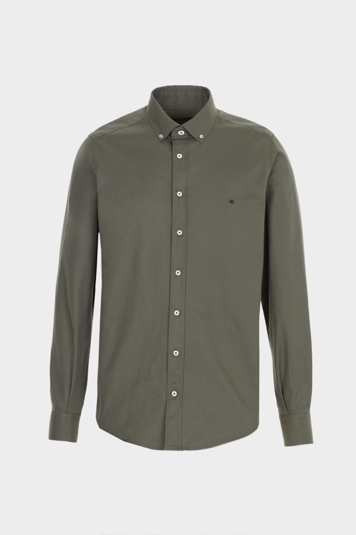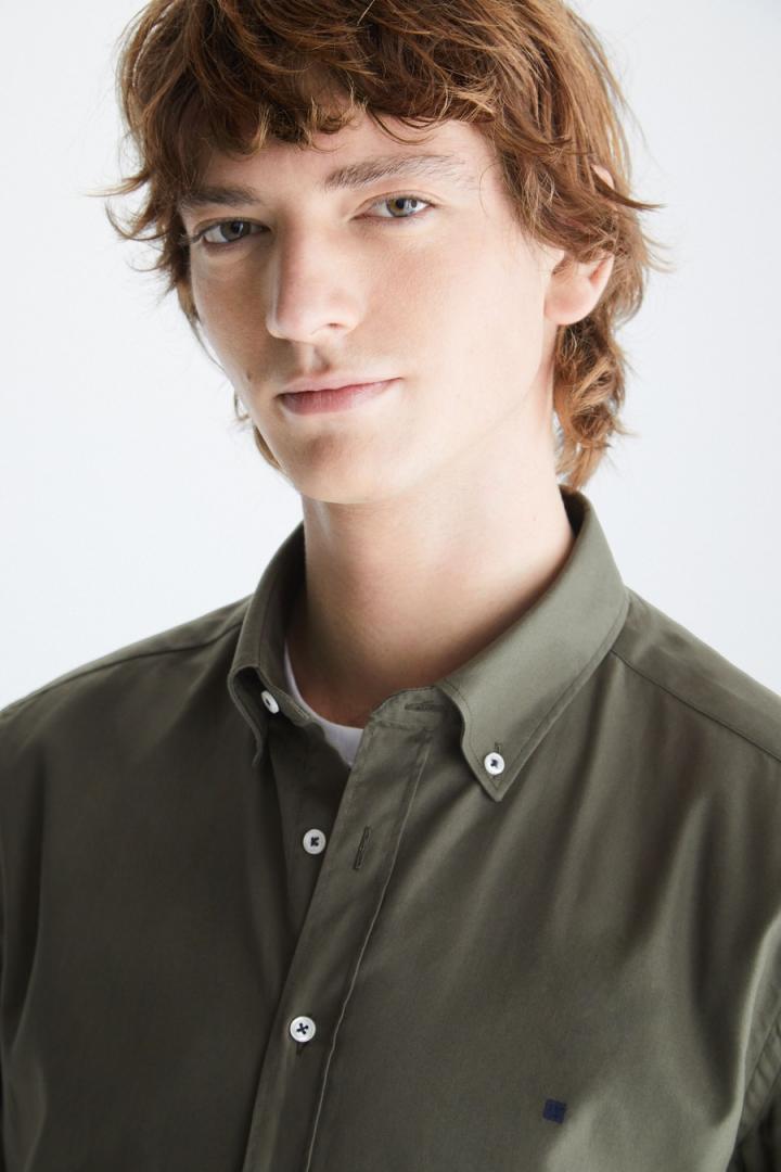 Camisa regular fit en sarga de algodón. Cuello abotonado e hilo de botón a contraste. Logo cubo bordado a contraste en pecho. El modelo mide 187 cm y lleva una talla 4.