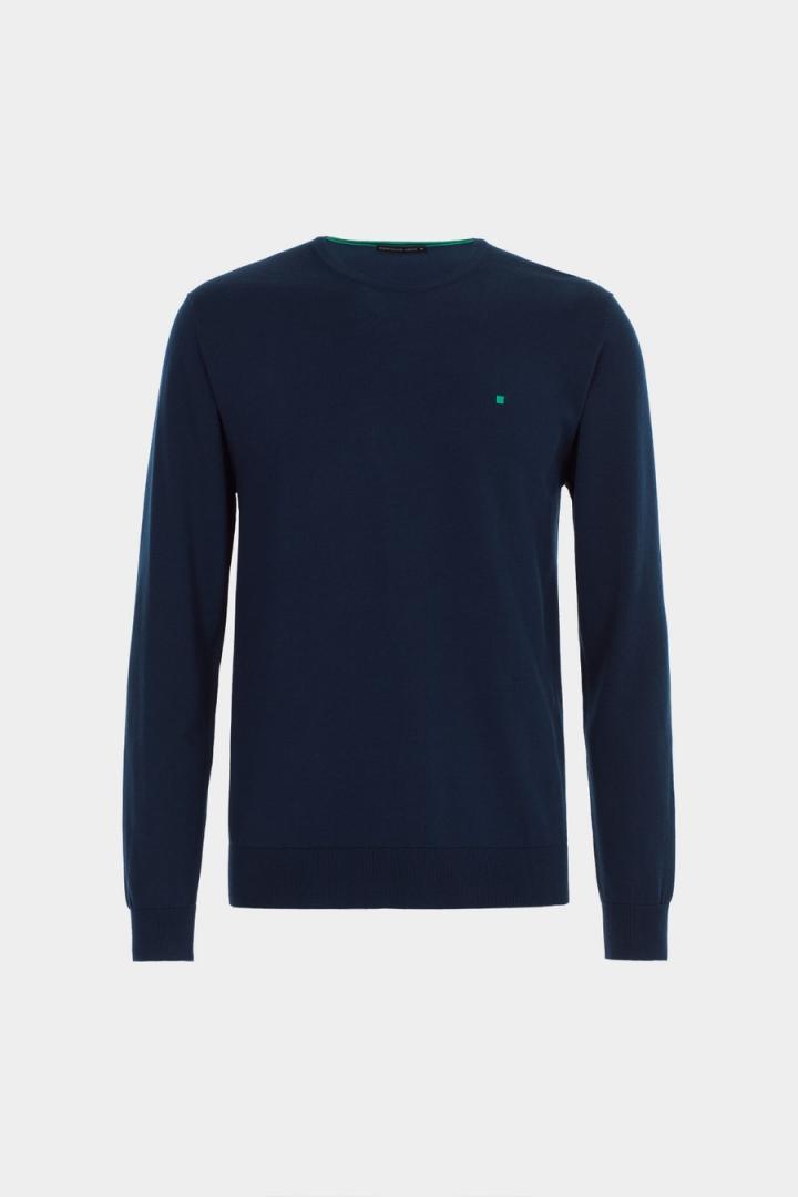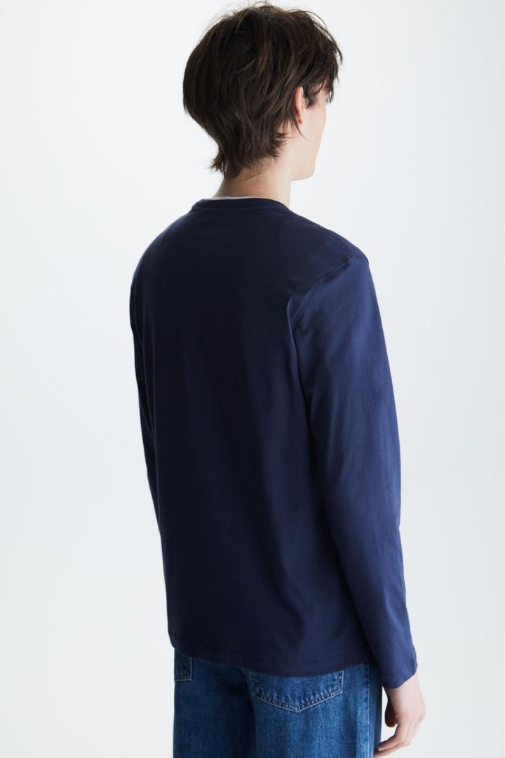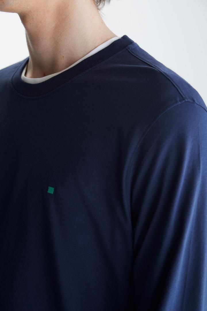 Camiseta regular fit en jersey de algodón con logo cubo bordado a contraste en el pecho. Cuello redondo y manga larga. El modelo mide 189 cm y lleva una talla M.