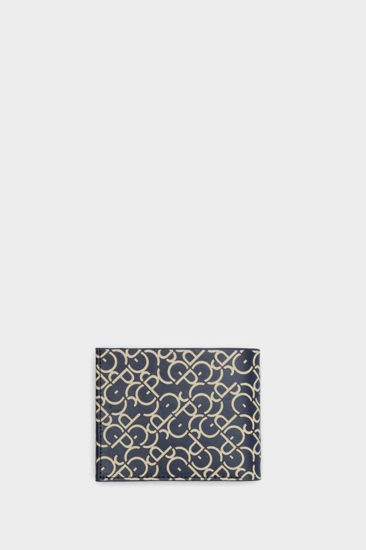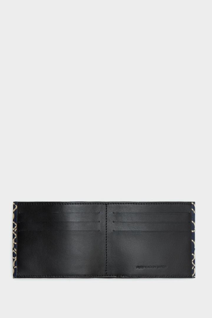 Cartera apaisada en piel con estampado Gutenberg bicolor. Interior a contraste con billetera simple y seis ranuras para tarjetas.