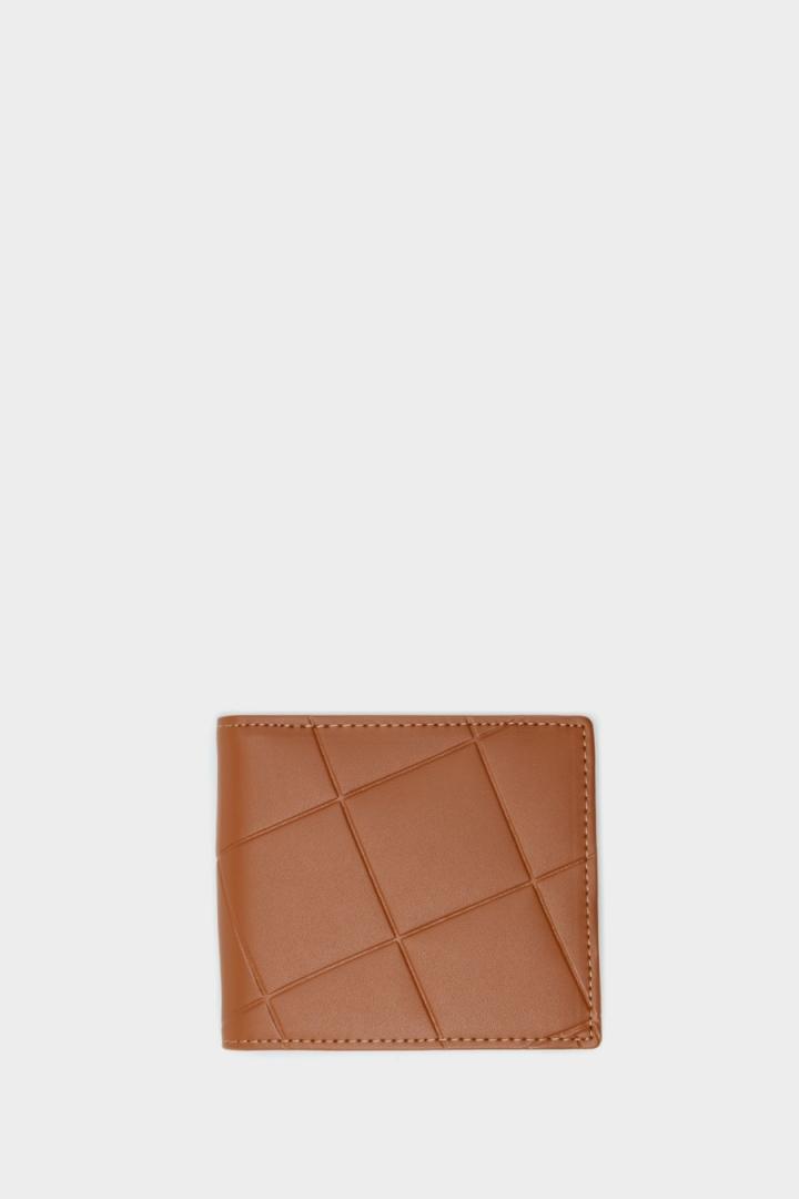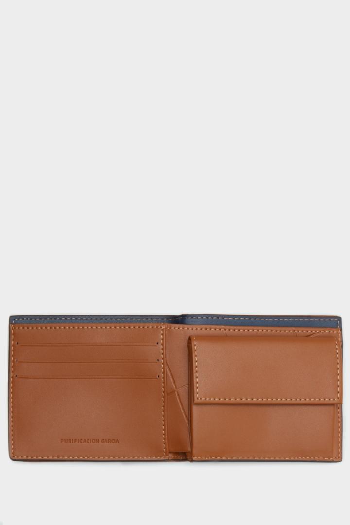 Cartera apaisada en piel con grabado Stamp de logo PG y cubos y pespuntes a contraste. Interior con monedero con cierre de broche, billetera simple y tres ranuras para tarjetas.