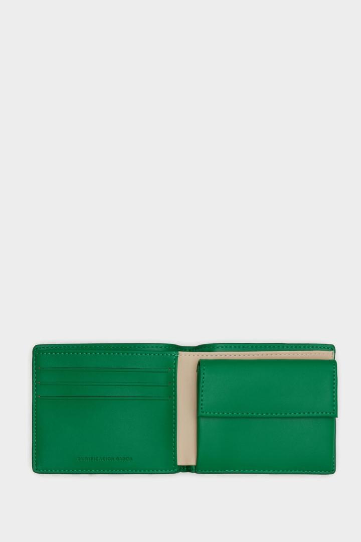 Cartera apaisada en piel con detalle de cubo PG metálico esmaltado. Interior con monedero, billetera simple y tres ranuras para tarjetas a contraste.