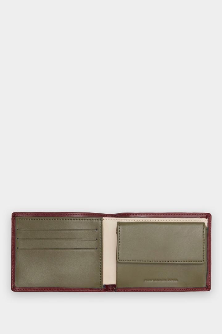 Cartera apaisada en piel con diseño Origami y detalle de logo PG grabado. Interior de piel a contraste con monedero, billetera simple y 3 ranuras para tarjetas.
