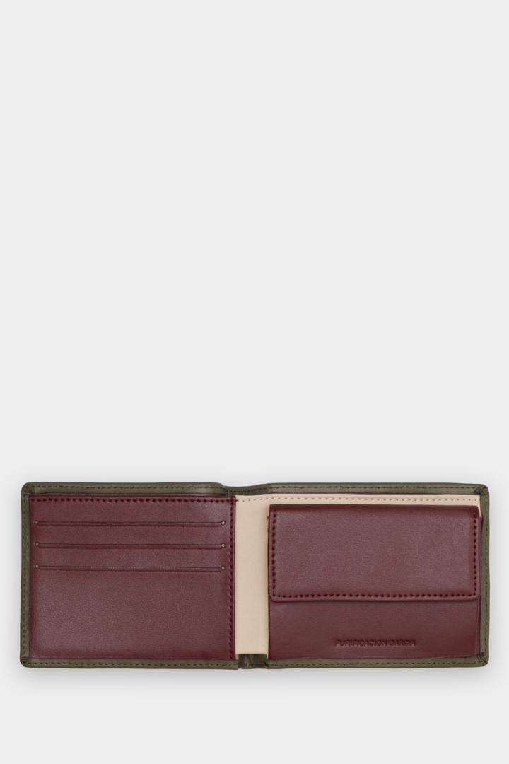 Cartera apaisada en piel con diseño Origami y detalle de logo PG grabado. Interior de piel a contraste con monedero, billetera simple y 3 ranuras para tarjetas.