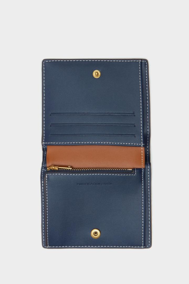 Cartera japonesa en piel con grabado Stamp de logo PG y cubos y pespuntes a tono. Cierre de solapa con broche e interior a co…
