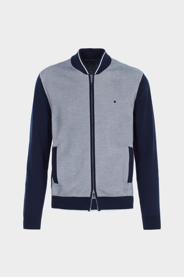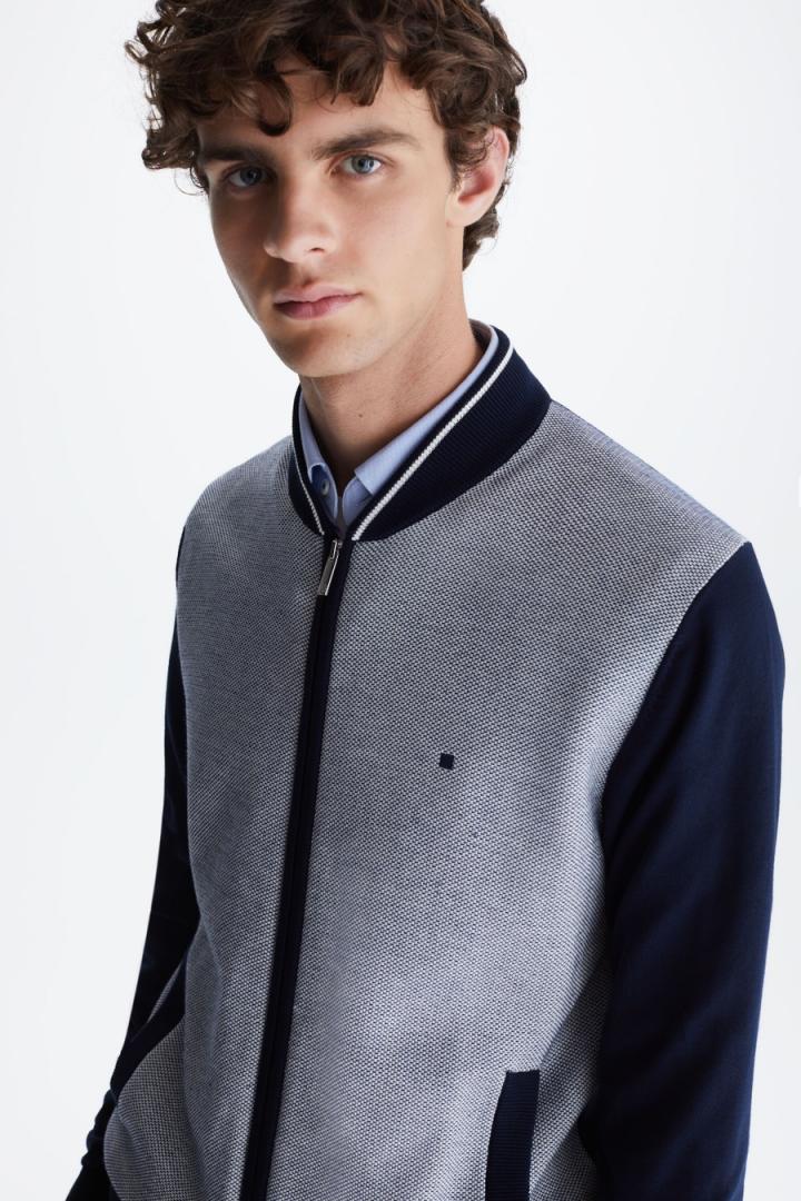 Cazadora bomber en punto jacquard de algodón pima con delantero a contraste. Cuello bomber, cierre de cremallera de doble cursor a tono y dos bolsillos de vivo….