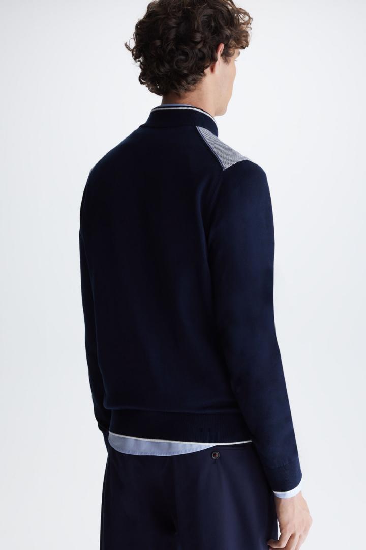 Cazadora bomber en punto jacquard de algodón pima con delantero a contraste. Cuello bomber, cierre de cremallera de doble cursor a tono y dos bolsillos de vivo. Raya y perfil a contraste en cuello, puños y bajo y logo cubo bordado a contraste en el pecho. El modelo mide 190 cm y lleva una talla M.