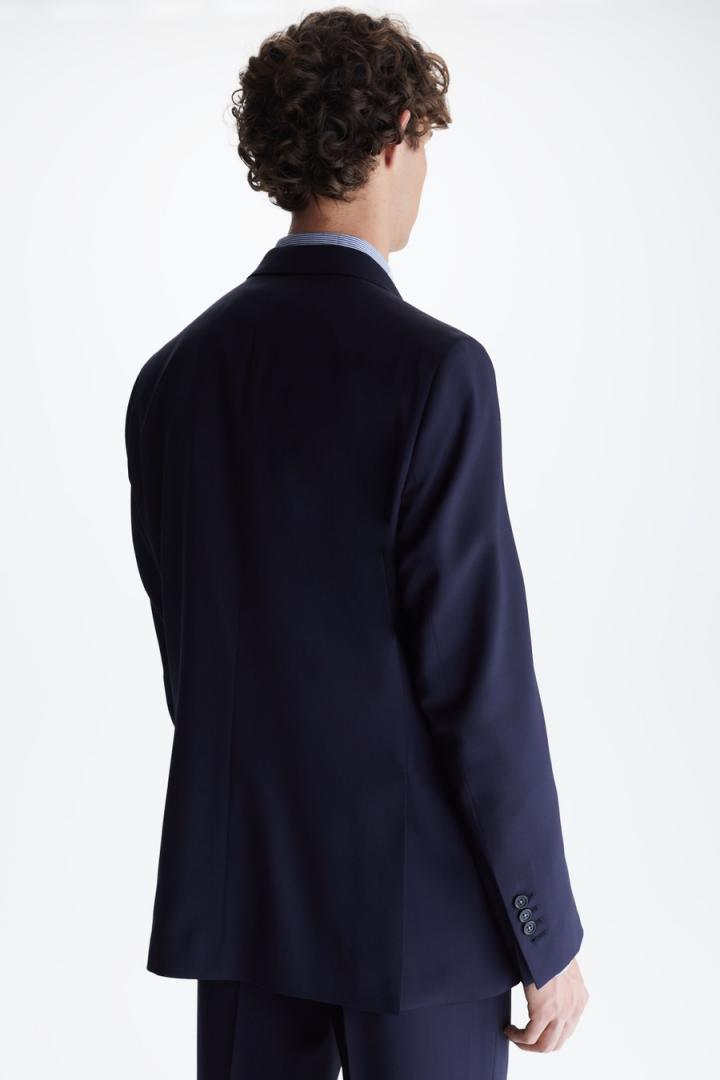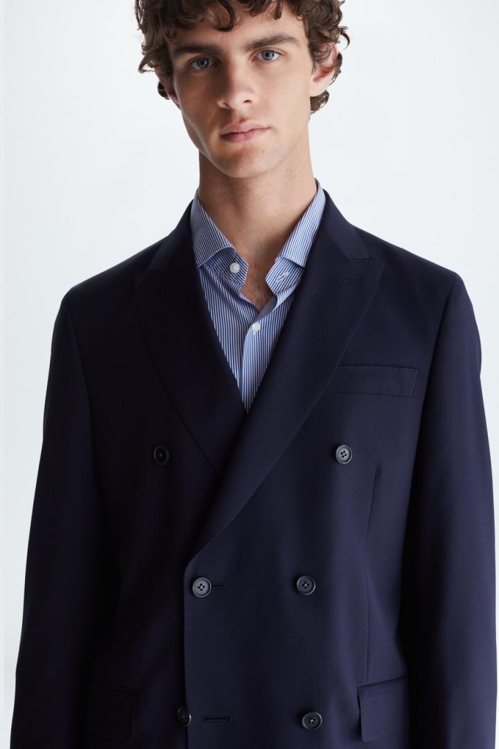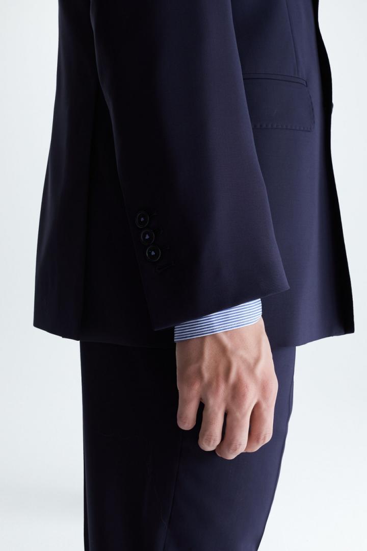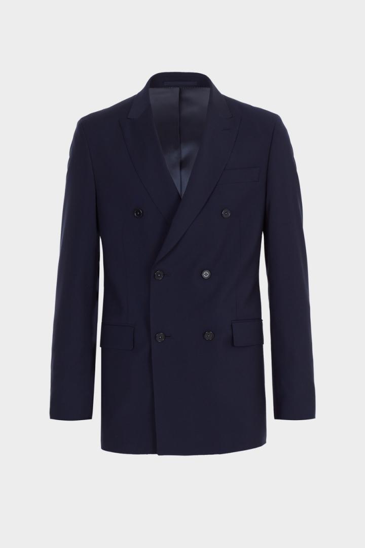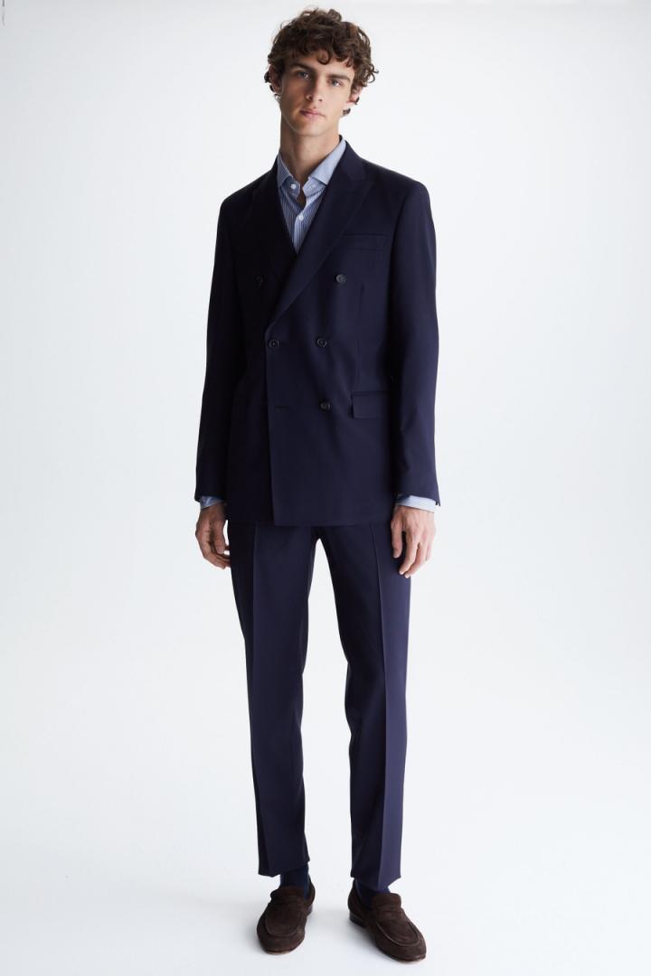 Chaqueta de traje classic fit en fresco de lana virgen. Cierre cruzado de seis botones y dos aberturas laterales. Dos bolsillos con tapeta y bolsillo cartera en pecho. Hombro desestructurado, forro completo y tres bolsillos interiores. Hilo de botón a tono. Logo cubo bordado a contraste en pie de cuello y cubo pin en solapa. Tiene pantalón de traje a conjunto. El modelo mide 190 cm y lleva una talla 50.