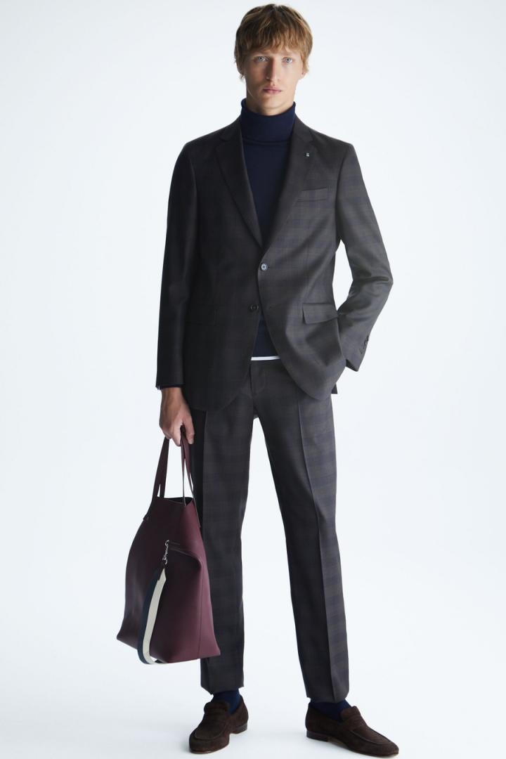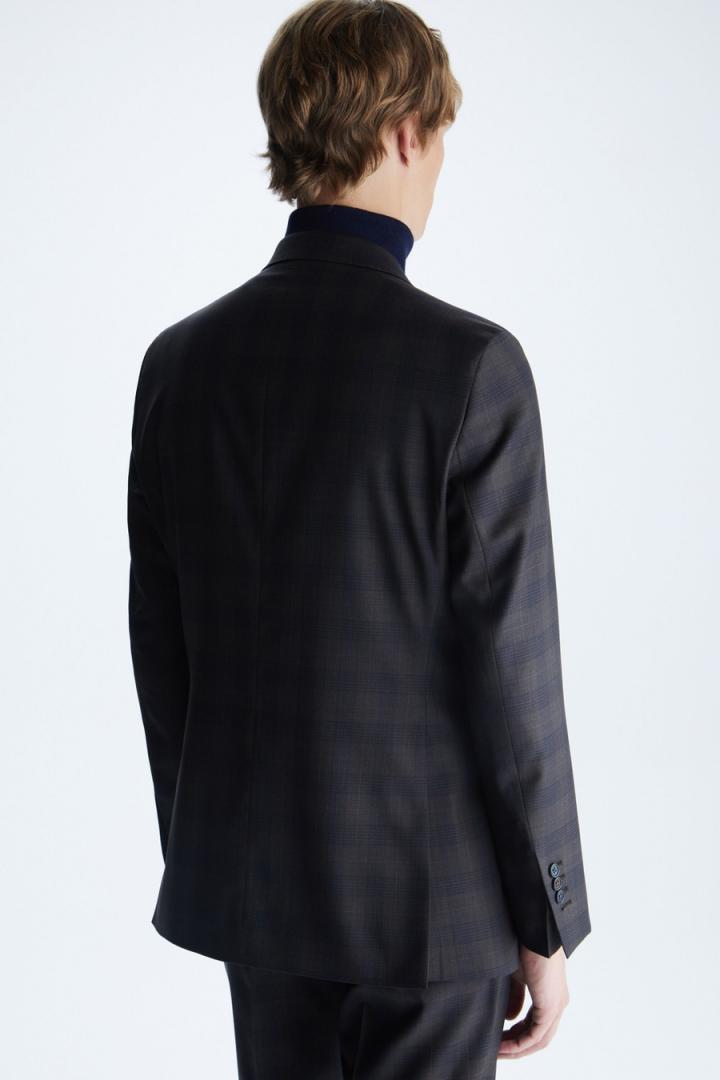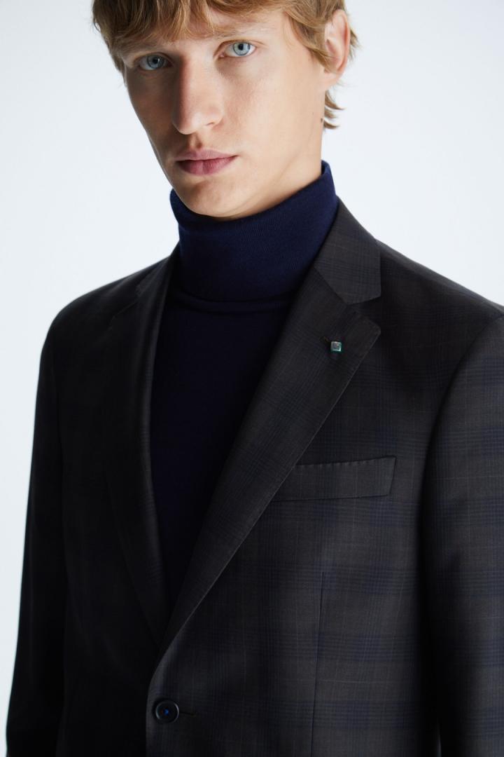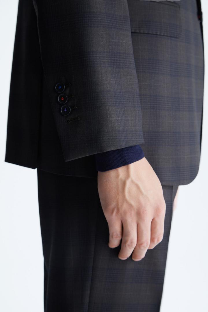Chaqueta de traje classic fit en lana virgen con diseño de cuadro gales. Cierre de dos botones y dos aberturas laterales. Dos bolsillos con tapeta y bolsillo cartera en pecho. Hombro desestructurado, forro completo y tres bolsillos interiores. Hilo de botón en secuencia de colores PG. Logo cubo bordado a contraste en pie de cuello y cubo pin en solapa. Tiene pantalón de traje a conjunto. El modelo mide 189 cm y lleva una talla 50.