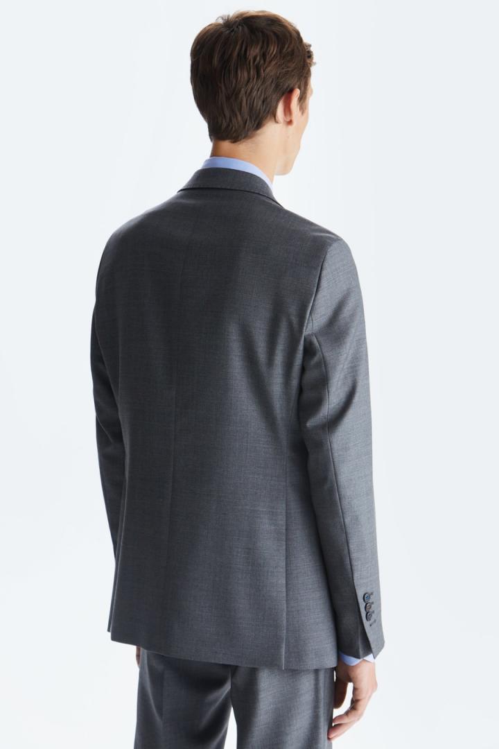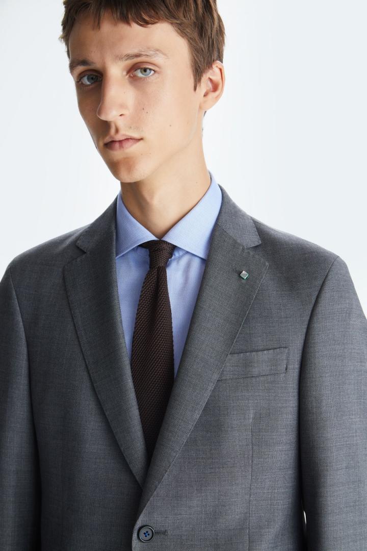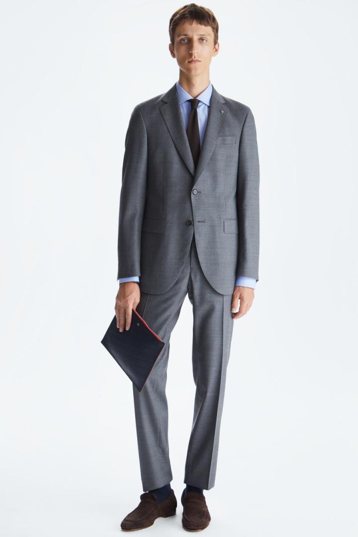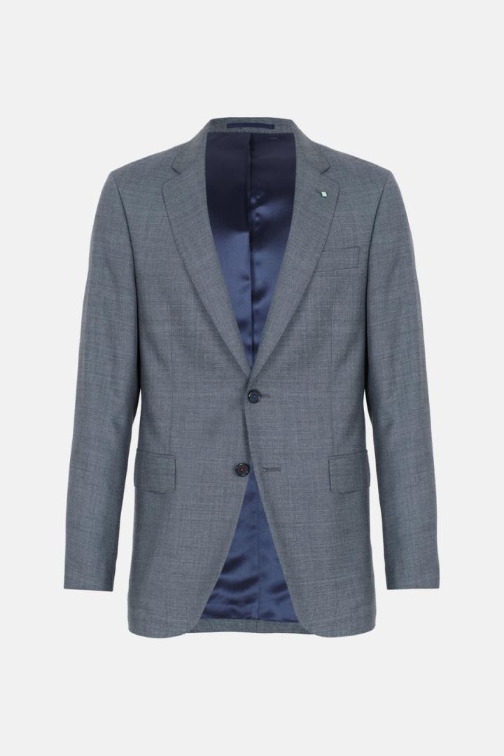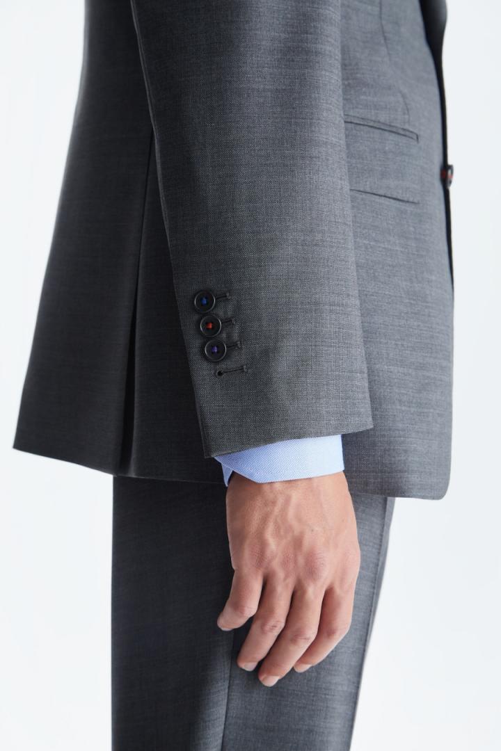 Chaqueta de traje classic fit en serreta de lana virgen. Cierre de dos botones y dos aberturas laterales. Dos bolsillos con tapeta y bolsillo cartera en pecho. Hombro desestructurado, forro completo y tres bolsillos interiores. Hilo de botón en secuencia de colores PG. Logo cubo bordado a contraste en pie de cuello y cubo pin en solapa. Tiene pantalón de traje a conjunto. El modelo mide 187 cm y lleva una talla 48.