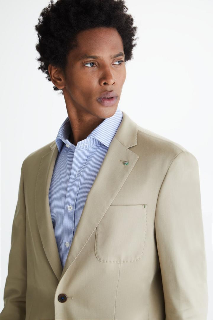 Chaqueta de traje relaxed fit en sarga de mezcla de liocel y algodón. Cierre de dos botones, dos aberturas laterales y tres bolsillos parche. Hombro d…
