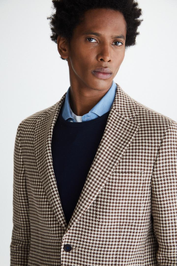Chaqueta relaxed fit en mezcla de lino y algodón con diseño de pata de gallo. Cierre de dos botones, dos aberturas laterales y tres bolsillos parche. Hombro desestructurado y forro delantero. Hilo de botón en secuencia de colores PG y logo cubo bordado a contraste bajo cuello. El modelo mide 189 cm y lleva una talla 50.