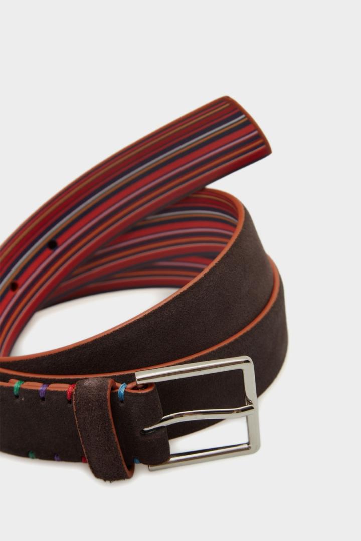 Cinturón de serraje con detalle de pespuntes en secuencia de colores PG y forro de rayas multicolor a contraste. Hebilla cuadrada metálica personalizada. Ancho: 3,2 cm