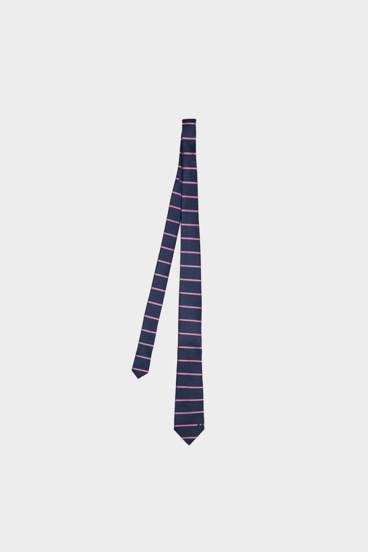 Corbata en estructura de seda con rayas rosas sobre fondo azul marino….