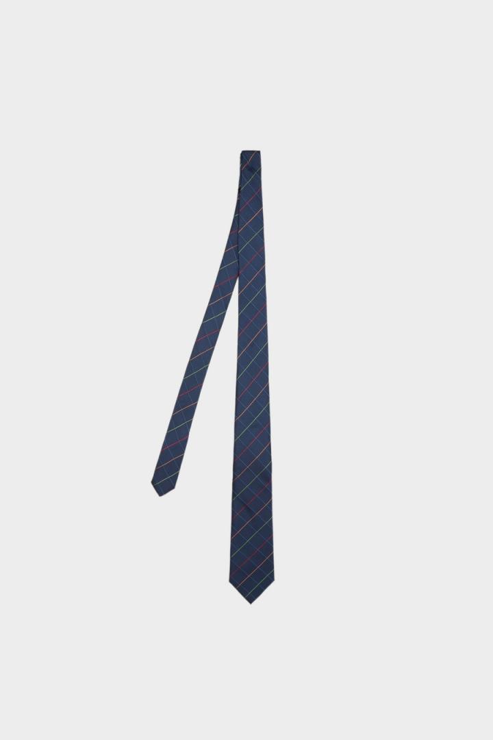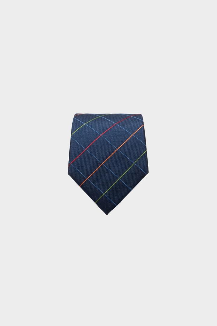 Corbata en seda con diseño de cuadros multicolor sobre fondo liso.