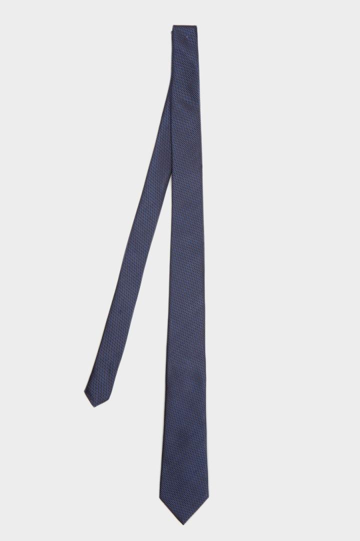 Corbata en seda con estructura de motivos sobre fondo liso.