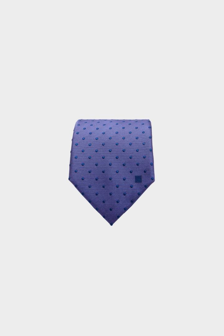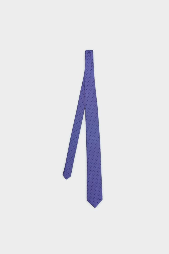 Corbata en seda con diseño de topos azules sobre fondo de otomán malva. Detalle de cubo a contraste en el bajo delantero….