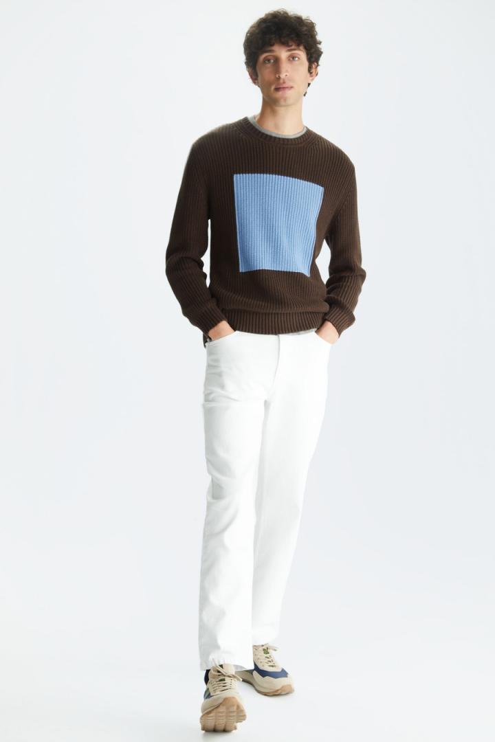 Jersey regular fit en punto perlado de algodón con intarsia de cubo a contraste en delantero. Cuello redondo y pespuntes a contraste en hombros. Logo cubo bordado a contraste en bajo. El modelo mide 188 cm y lleva una talla M.