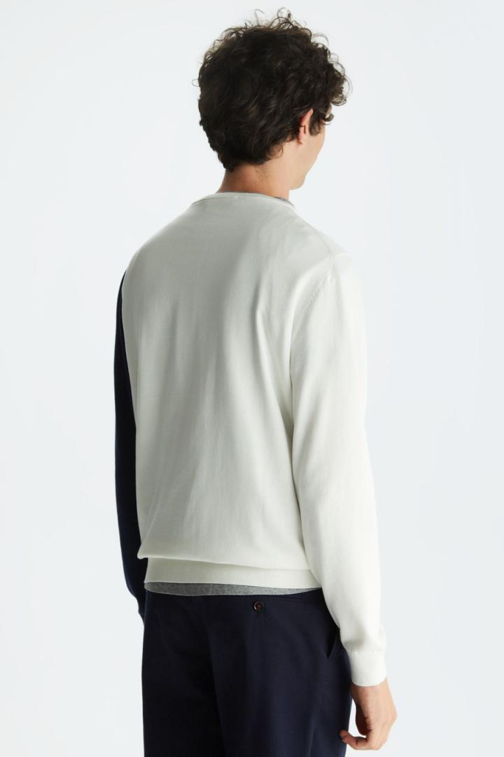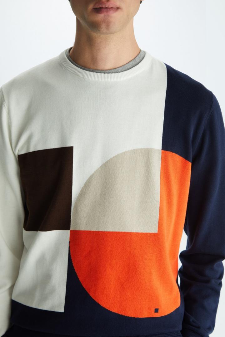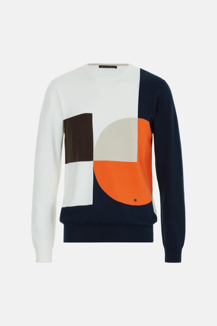 Jersey regular fit en punto de algodón pima con intarsia geométrica en delantero. Cuello redondo y logo cubo bordado a contraste en bajo. El modelo mide 188 cm y lleva una talla M.