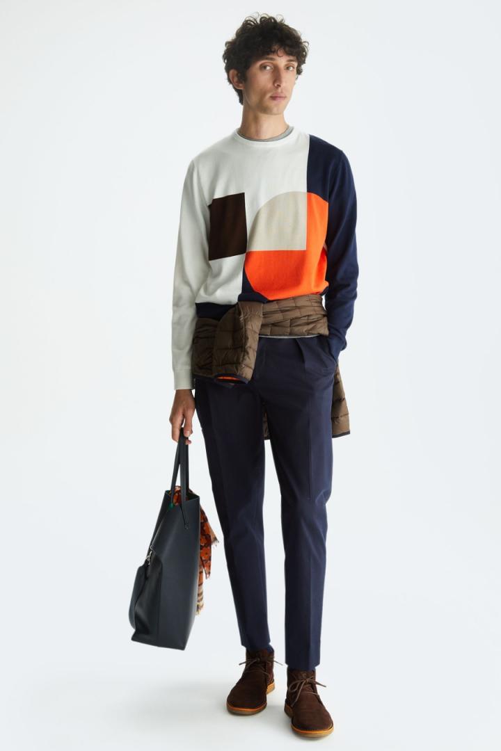 Jersey regular fit en punto de algodón pima con intarsia geométrica en delantero. Cuello redondo y logo cubo bordado a contraste en bajo. El modelo mide 188 cm y lleva una talla M….
