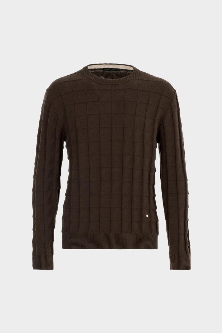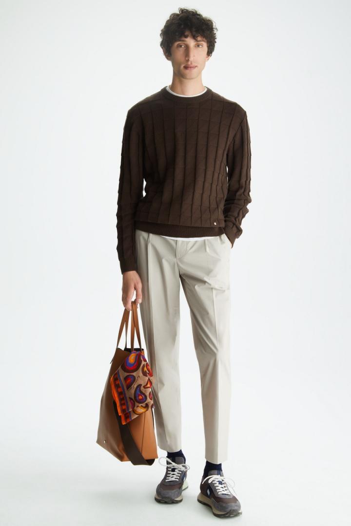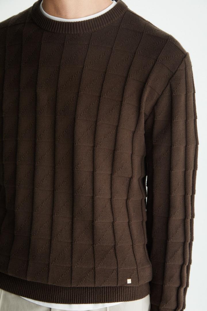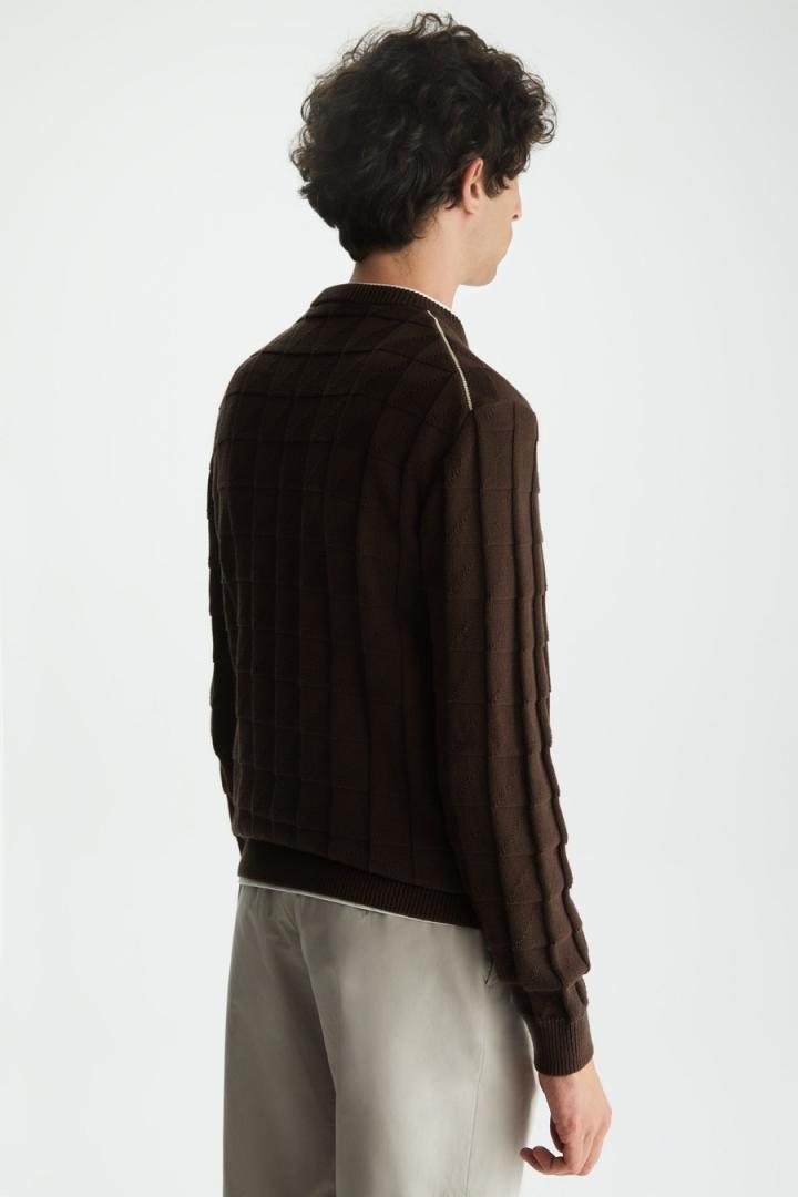 Jersey regular fit en estructura de punto de algodón peinado con diseño Origami. Cuello redondo, pespuntes a contraste en hombros y logo cubo bordado a contraste en el bajo delantero. El modelo mide 188 cm y lleva una talla M.