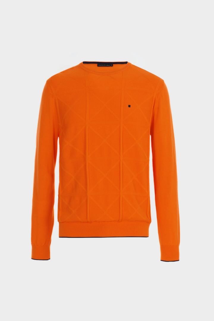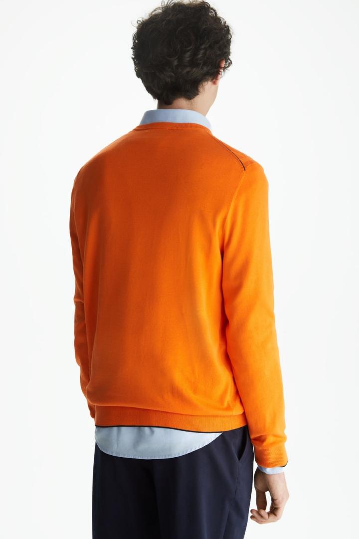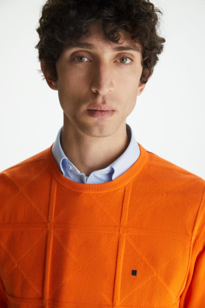 Jersey regular fit en estructura de punto de algodón pima con diseño Origami en el delantero. Cuello redondo, pespuntes a contraste en hombros, perfil a contraste en puños y bajo y logo cubo bordado a contraste en el pecho. El modelo mide 188 cm y lleva una talla M.