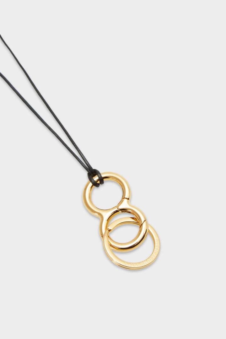 Llavero bañado en oro formado por un mosquetón en forma de ocho y un cordón de piel a contraste.