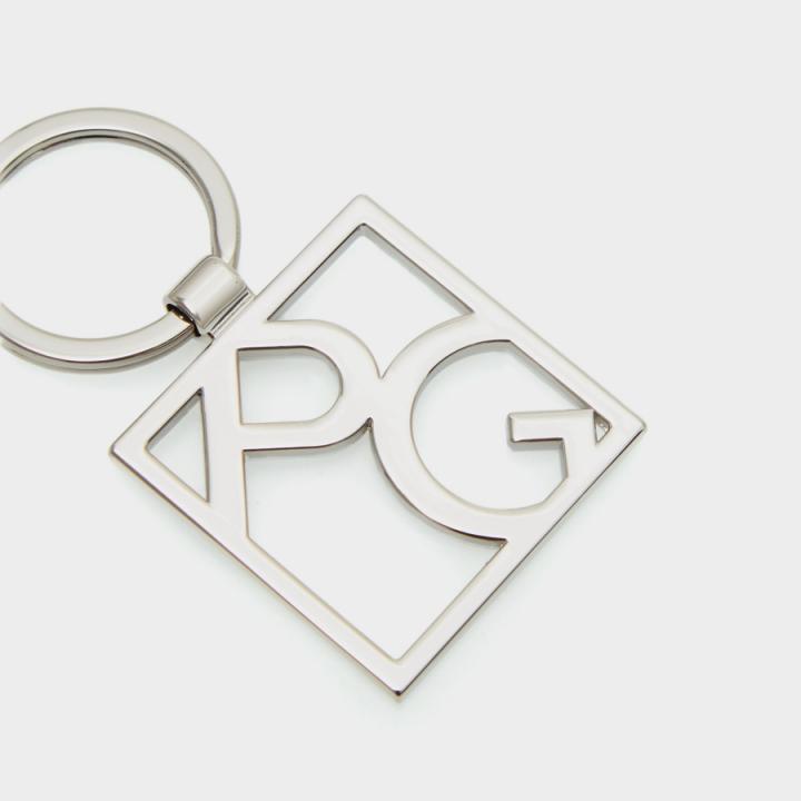 Llavero bañado en rodio formado por un cubo con letras PG.