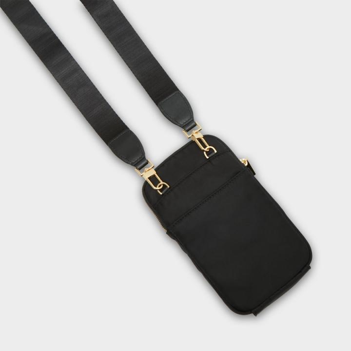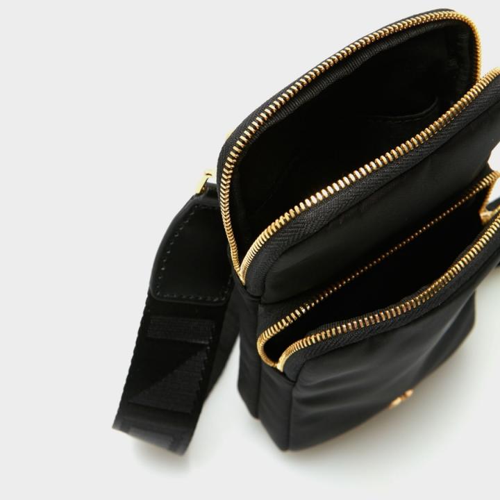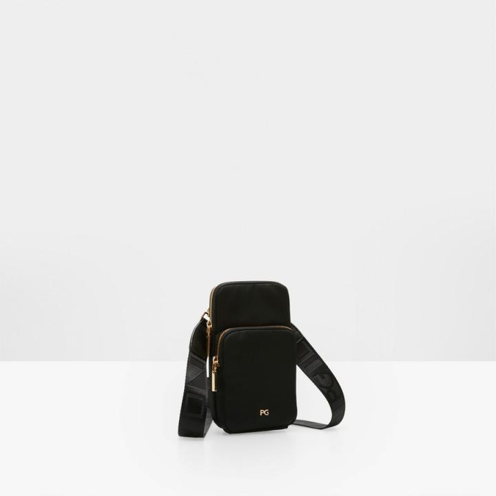Mini bolso para móvil en nylon. Dos bolsillos frontales con cierre de cremallera, un bolsillo parche trasero y pequeño bolsillo interior. Asa bandolera extraíble de grosgrain.