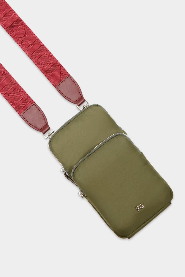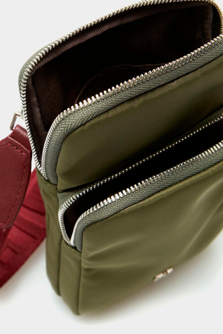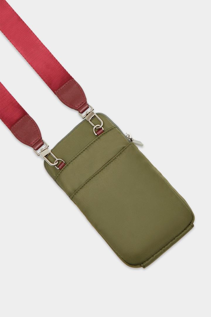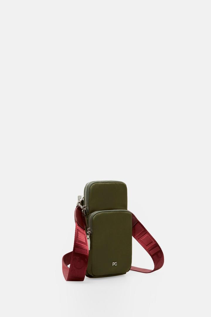 Mini bolso para móvil en nylon. Dos bolsillos frontales con cierre de cremallera, un bolsillo parche trasero y pequeño bolsillo interior. Asa bandolera extraíble de grosgrain.