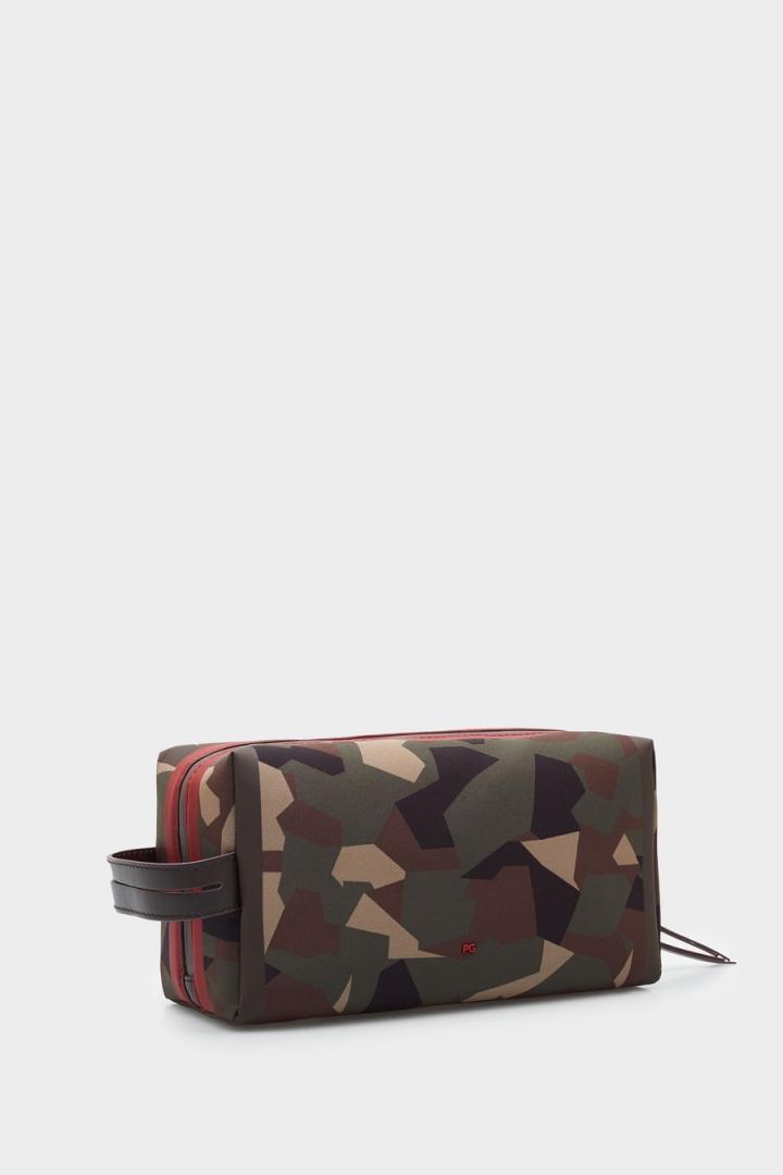 Neceser en neopreno con estampado de camuflaje y asa lateral en piel. Cierre de cremallera termosellada y tirador en piel.