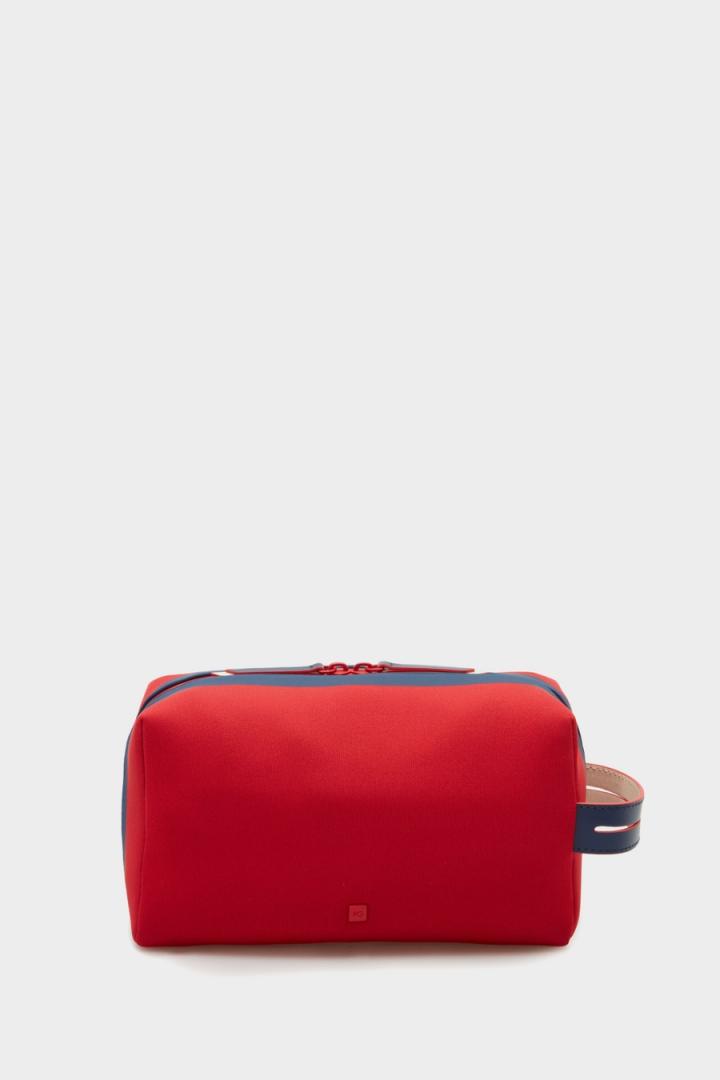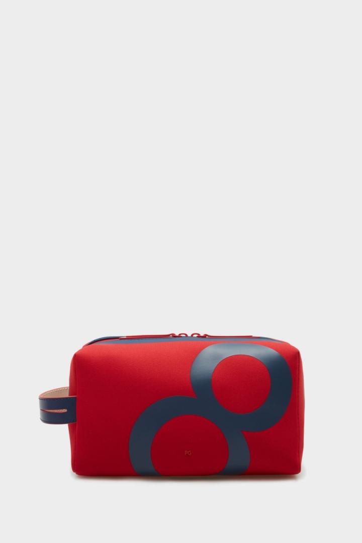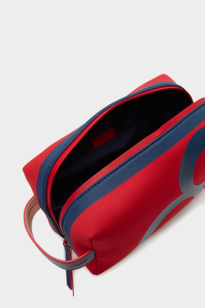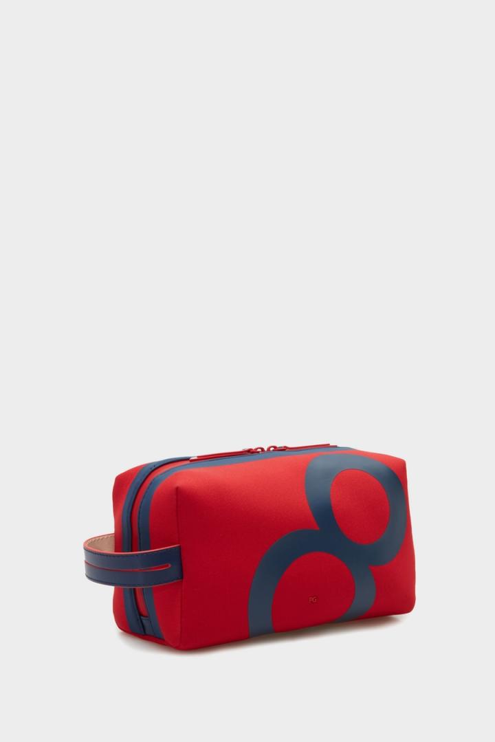 Neceser en neopreno con estampado Ocho y asa lateral de piel a contraste. Cierre de cremallera de doble cursor e interior con forro completo.
