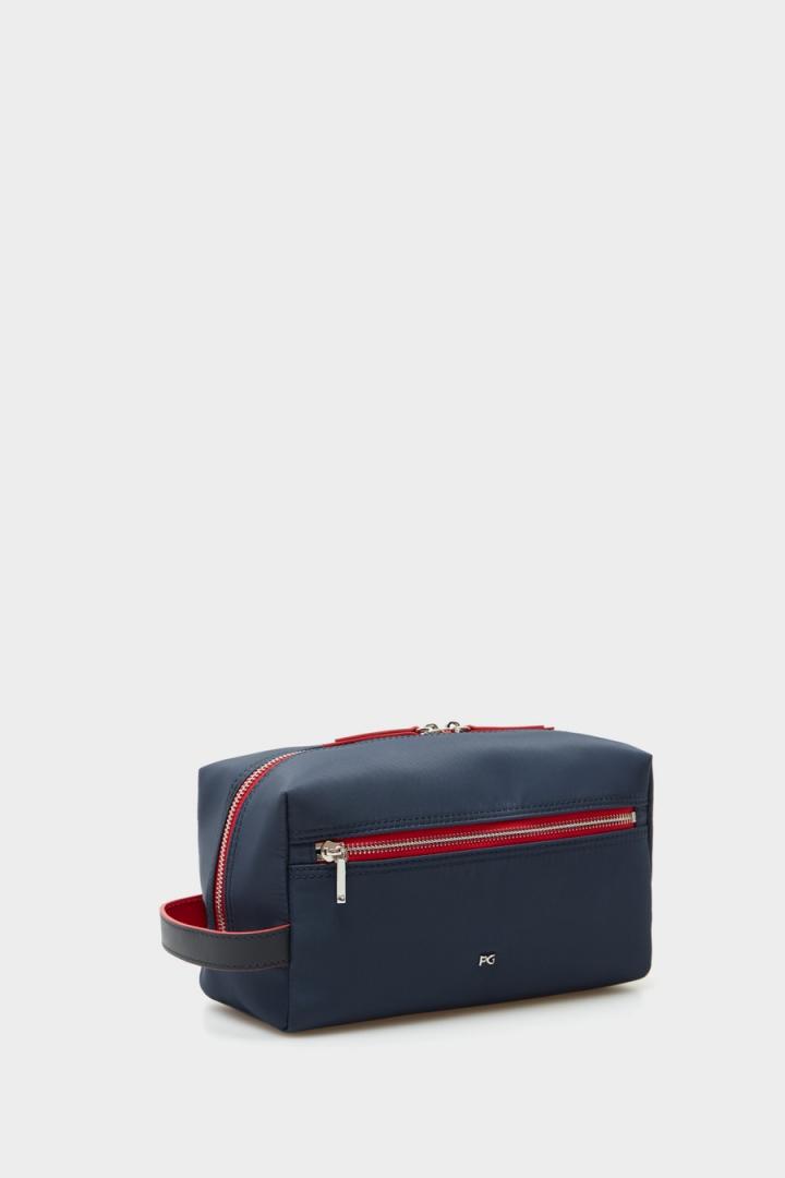 Neceser en nylon con bolsillo exterior de cremallera y detalle de logo PG metálico. Asa de piel y cierre de cremallera de doble cursor con tiradores en piel.