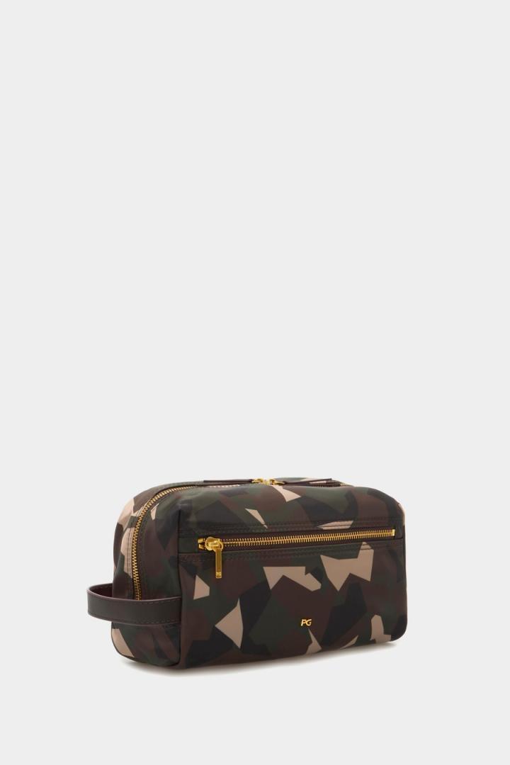 Neceser en nylon con estampado de camuflaje geométrico. Bolsillo exterior de cremallera y asa lateral de piel. Cierre de cremallera de doble cursor con tiradores de piel.