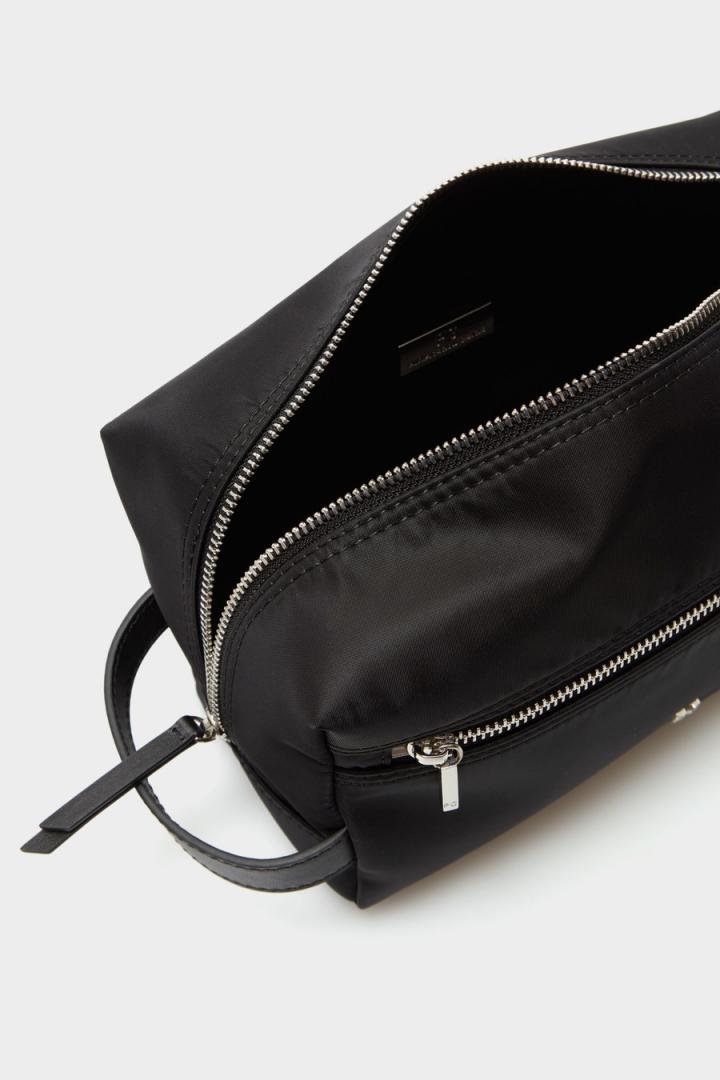 Neceser en nylon con bolsillo exterior de cremallera y detalle de logo PG metálico. Asa de piel y cierre de cremallera de doble cursor con tiradores en piel.
