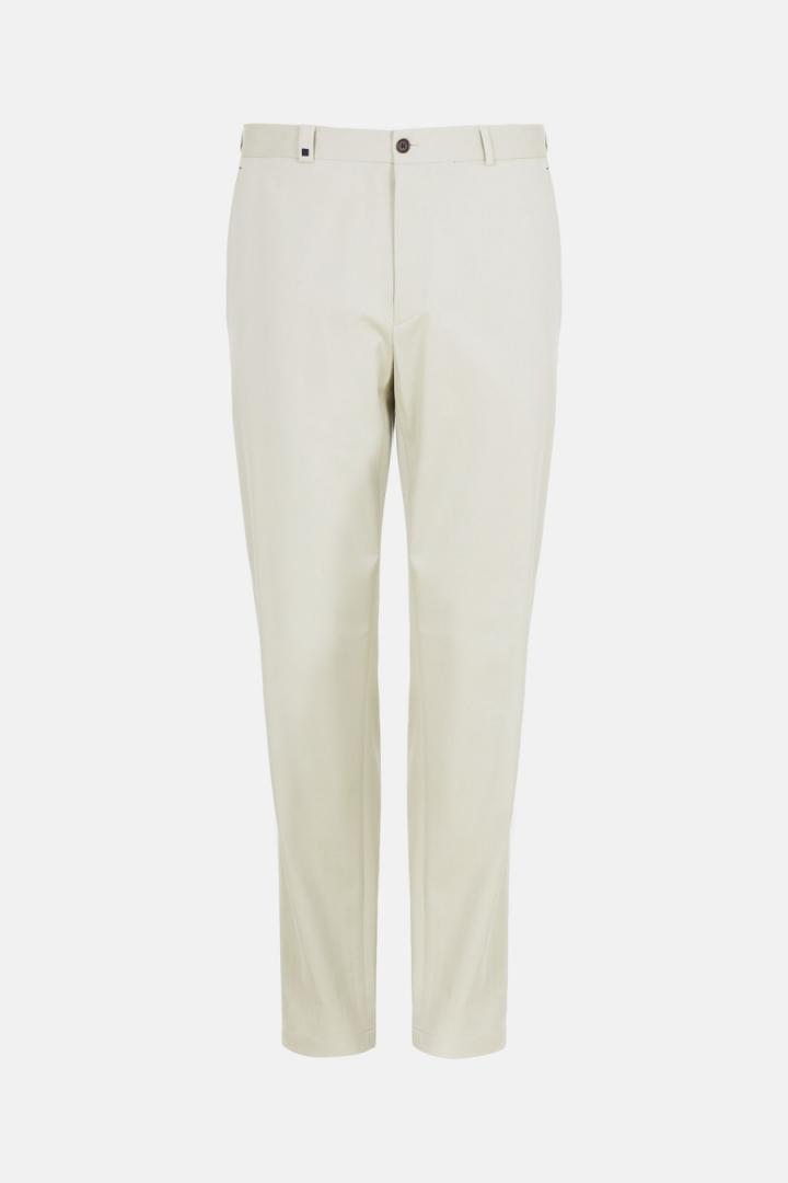 Pantalón chino regular fit en sarga de mezcla de algodón y liocel. Cierre de botón y cremallera oculta. Bolsillos laterales y dos bolsillos traseros con vivo y botón. Logo cubo bordado a contraste en pasador delantero. El modelo mide 188 cm y lleva una talla 40.
