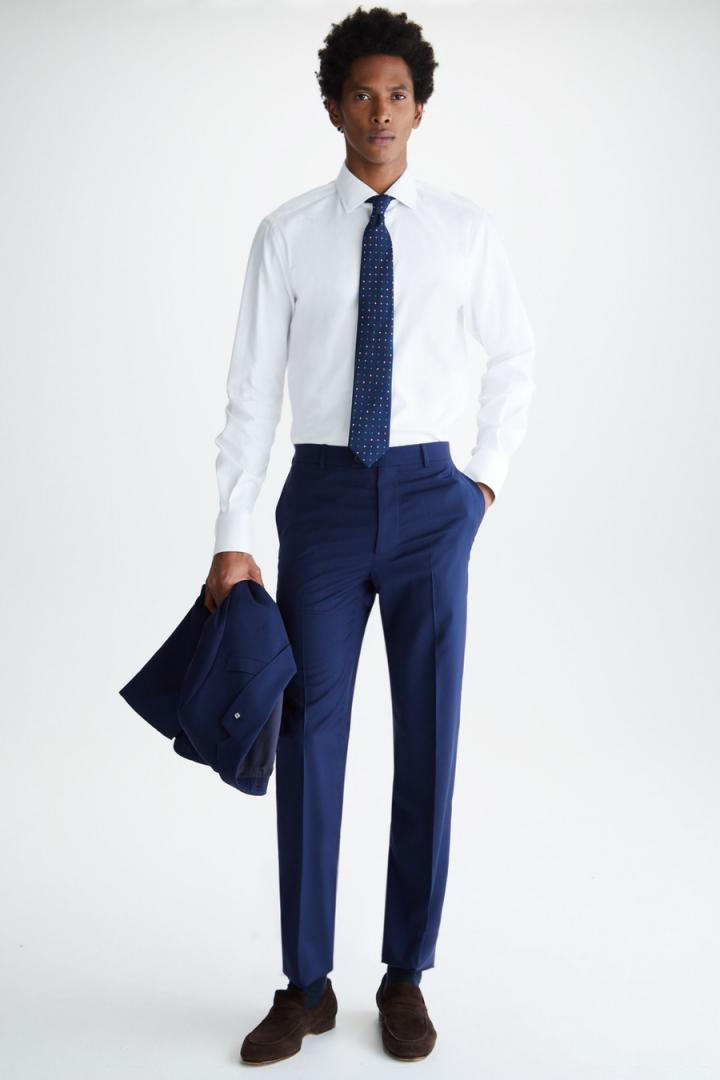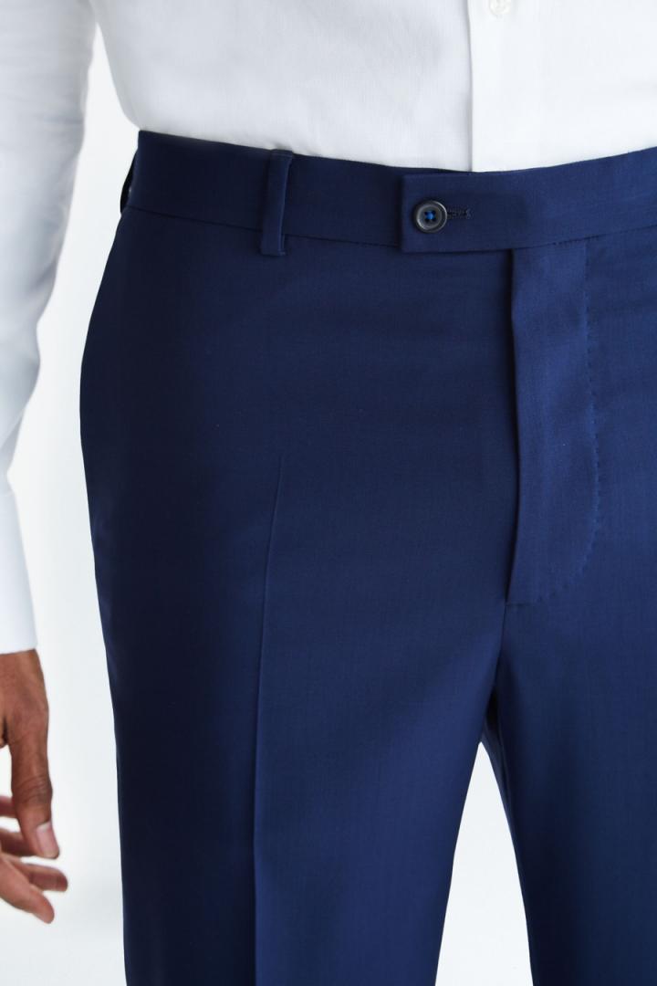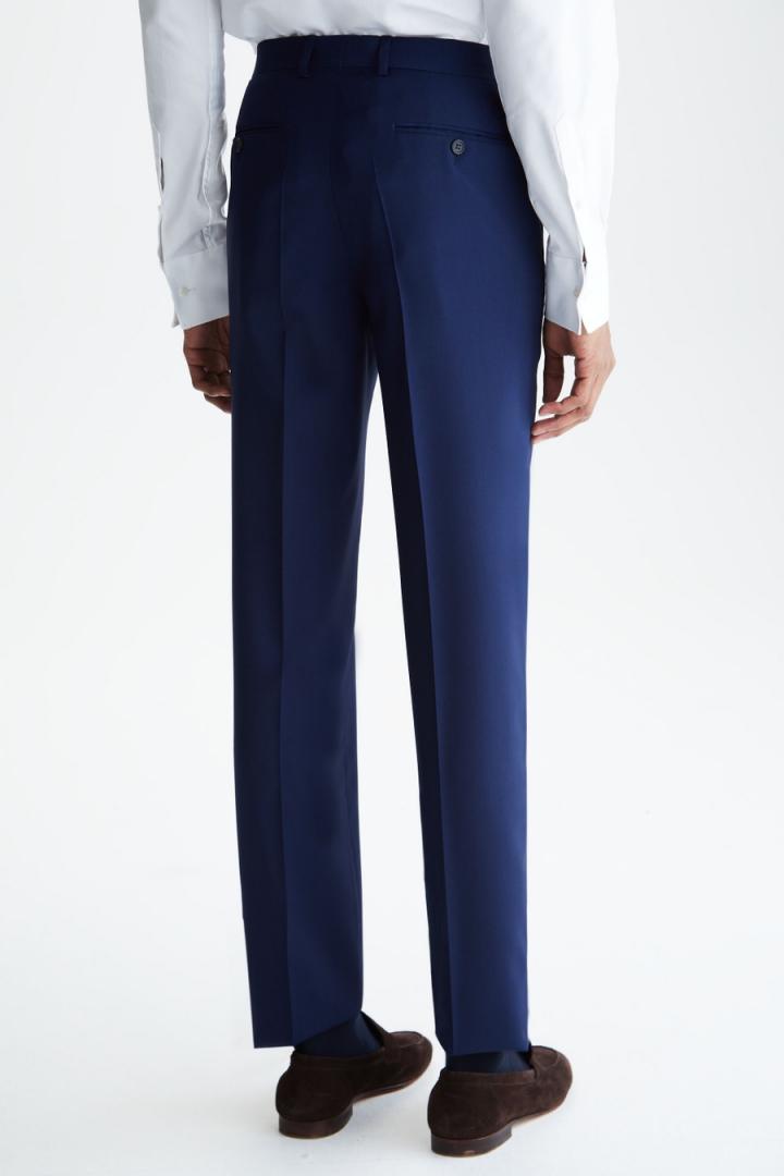 Pantalón de traje classic fit en fresco de lana virgen. Cierre de botón y cremallera oculta. Bolsillos laterales y dos bolsillos traseros de doble vivo con botón. Hilo de botón en secuencia de colores PG. Tiene chaqueta de traje a conjunto. El modelo mide 189 cm y lleva una talla 40.