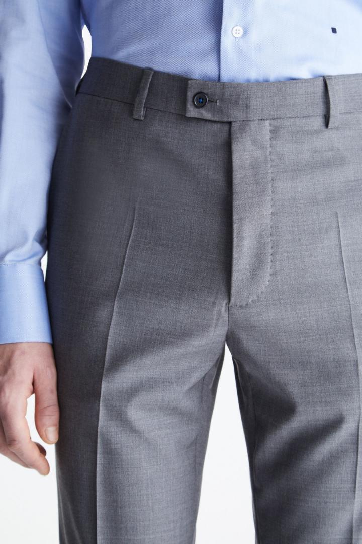 Pantalón de traje classic fit en fresco de lana virgen. Cierre de botón y cremallera oculta. Bolsillos laterales y dos bolsillos traseros de doble vivo con botón. Hilo de botón en secuencia de colores PG. Tiene chaqueta de traje a conjunto. El modelo mide 187 cm y lleva una talla 40.