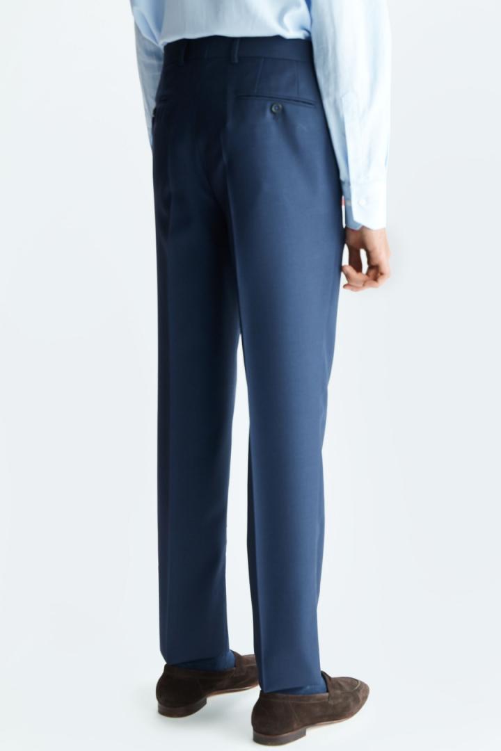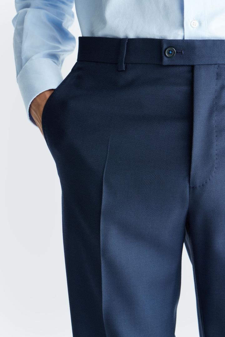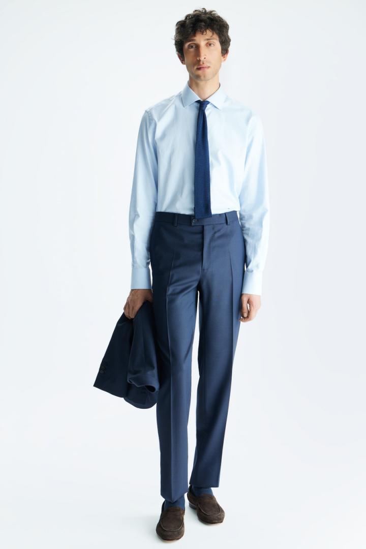Pantalón de traje classic fit en ojo de perdiz de lana virgen. Bolsillos laterales y dos bolsillos traseros con doble vivo y botón. Tiene chaqueta de traje a conjunto. El modelo mide 188 cm y lleva una talla 40.